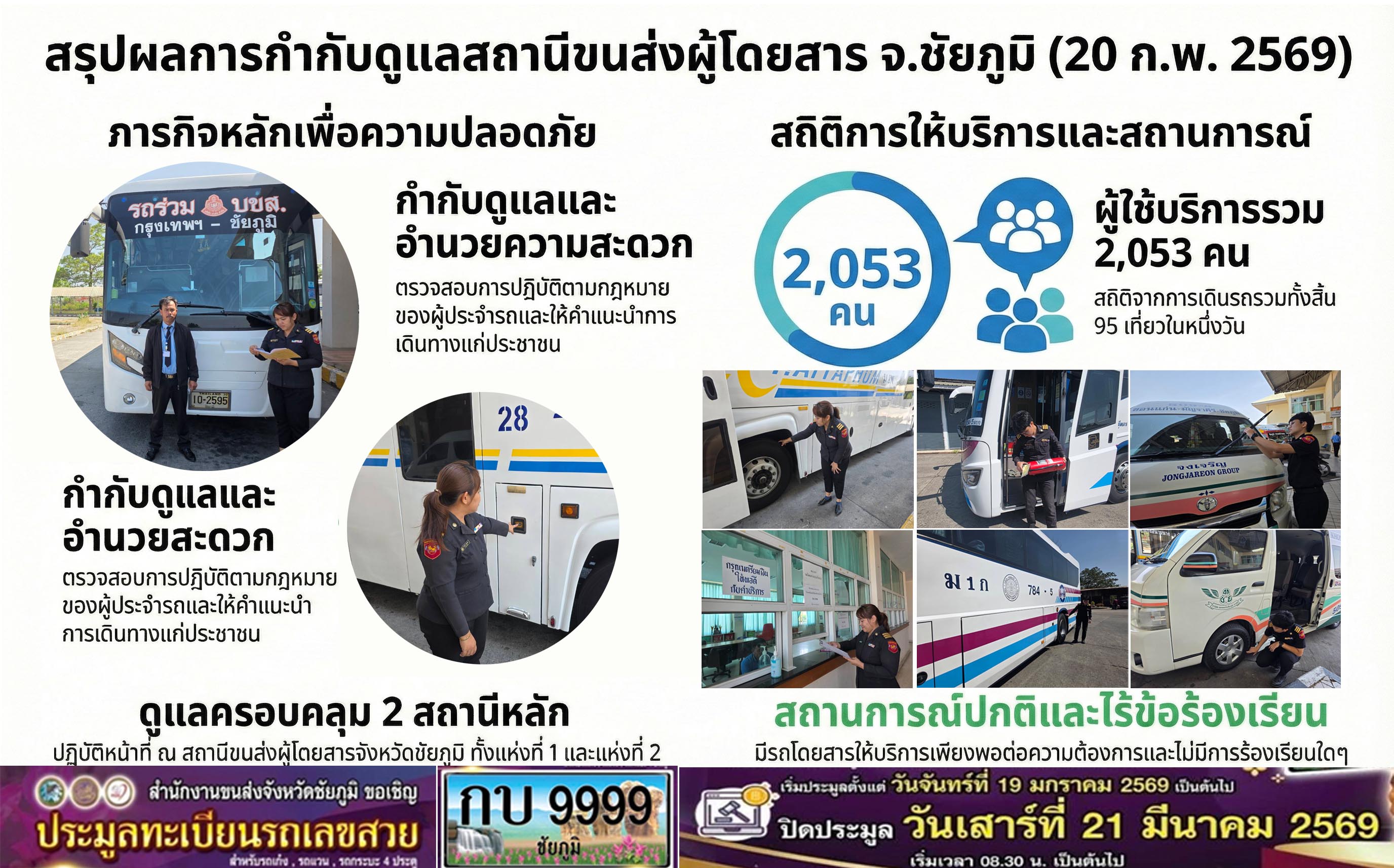สำนักงานขนส่งจังหวัดชัยภูมิ ดำเนินการกำกับ ดูแล การจัดการเดินรถโดยสารสาธารณะ ณ สถานีขนส่งผู้โดยสารจังหวัดชัยภูมิ  เพื่อให้ผู้ประกอบการขนส่ง และผู้ประจำรถปฏิบัติตามกฎหมาย รวมทั้งดูแลอำนวยความสะดวก ให้คำแนะนำในการเดินทาง และดูแลความปลอดภัยให้แก่ผู้โดยสารที่เข้าใช้บริการสถานีขนส่งผู้โดยสาร สถานการณ์โดยรวมเหตุการณ์ปกติ มีรถโดยสารให้บริการประชาชนเพียงพอ และไม่มีเรื่องร้องเรียนเกี่ยวกับรถโดยสารสาธารณะ