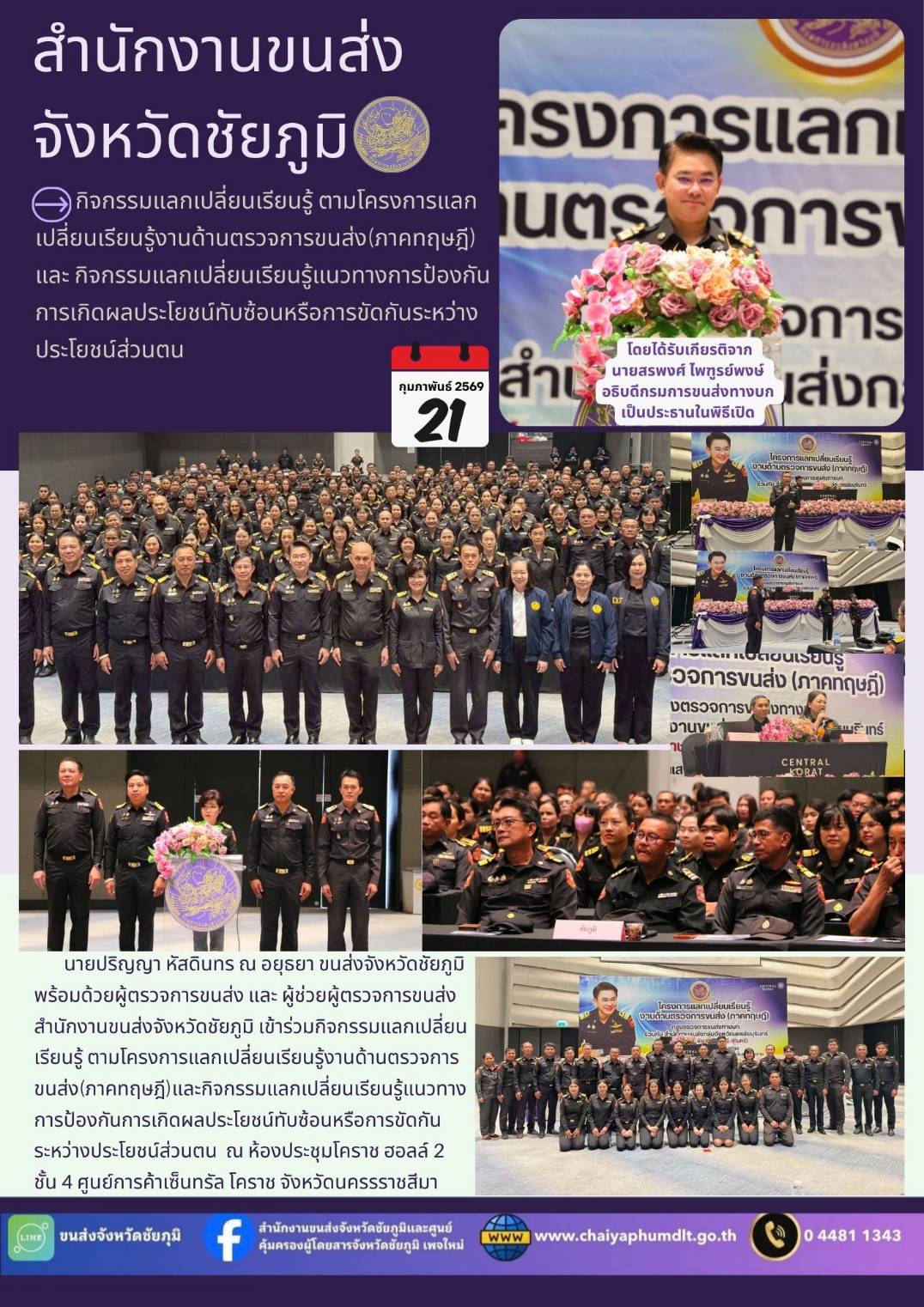 สำนักงานขนส่งจังหวัดชัยภูมิ โดย นายปริญญา หัสดินทร ณ อยุธยา ขนส่งจังหวัดชัยภูมิ พร้อมด้วยผู้ตรวจการขนส่งและผู้ช่วยผู้ตรวจการขนส่ง สำนักงานขนส่งจังหวัดชัยภูมิ เข้าร่วมกิจกรรมแลกเปลี่ยนเรียนรู้ ตามโครงการแลกเปลี่ยนเรียนรู้งานด้านตรวจการขนส่ง(ภาคทฤษฎี) และกิจกรรมแลกเปลี่ยนเรียนรู้ แนวทางการป้องกันการเกิดผลประโยชน์ทับซ้อนหรือการขัดกันระหว่างประโยชน์ส่วนตน ณ ห้องประชุมโคราช ฮอลล์ 2 ชั้น 4 ศูนย์การค้าเซ็นทรัล โคราช อำเภอเมืองนครราชสีมา จังหวัดนครราชสีมา โดยได้รับเกียรติจาก นายสรพงศ์ ไพฑูรย์พงษ์ อธิบดีกรมการขนส่งทางบก เป็นประธานในพิธีเปิด