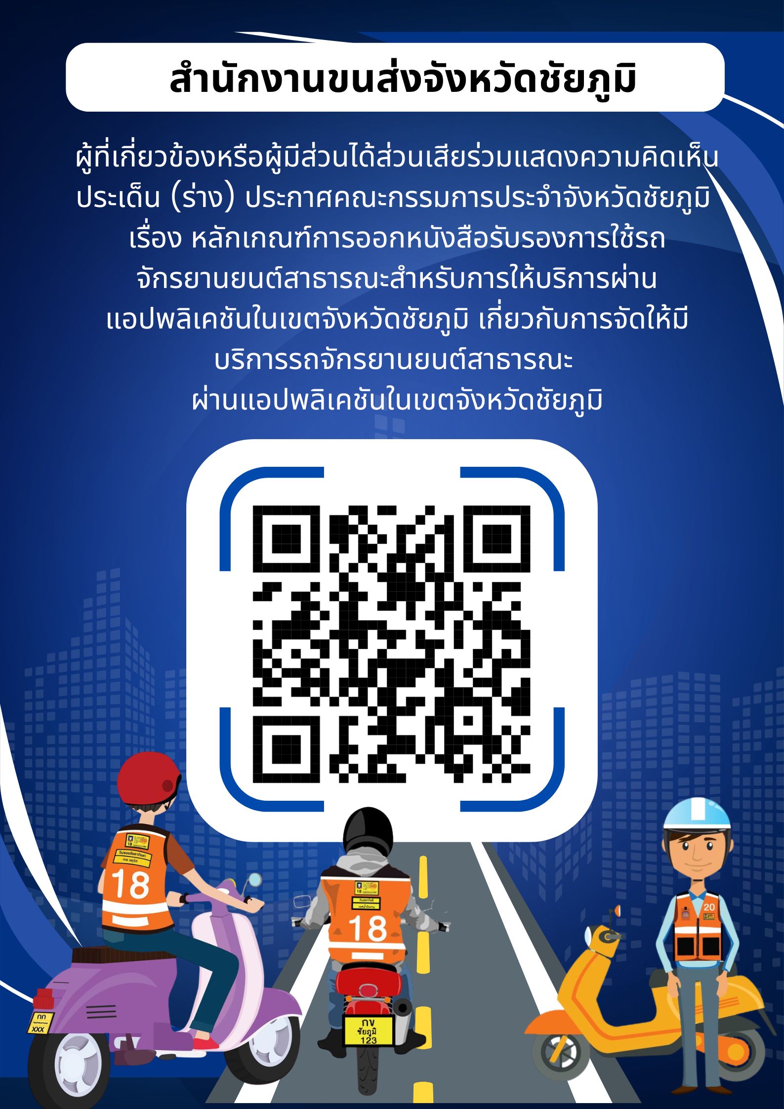 ร่วมแสดงความคิดเห็นประเด็น (ร่าง) ประกาศคณะกรรมการประจำจังหวัดชัยภูมิ เรื่อง หลักเกณฑ์การออกหนังสือรับรองการใช้รถจักรยานยนต์สาธารณะสำหรับการให้บริการผ่านแอปพลิเคชันในเขตจังหวัดชัยภูมิ เกี่ยวกับการจัดให้มีบริการรถจักรยานยนต์สาธารณะ ผ่านแอปพลิเคชันในเขตจังหวัดชัยภูมิ