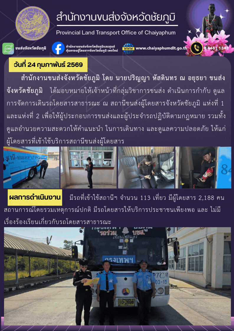ดำเนินการกำกับ ดูแล การจัดการเดินรถโดยสารสาธารณะ ณ สถานีขนส่งผู้โดยสารจังหวัดชัยภูมิ
