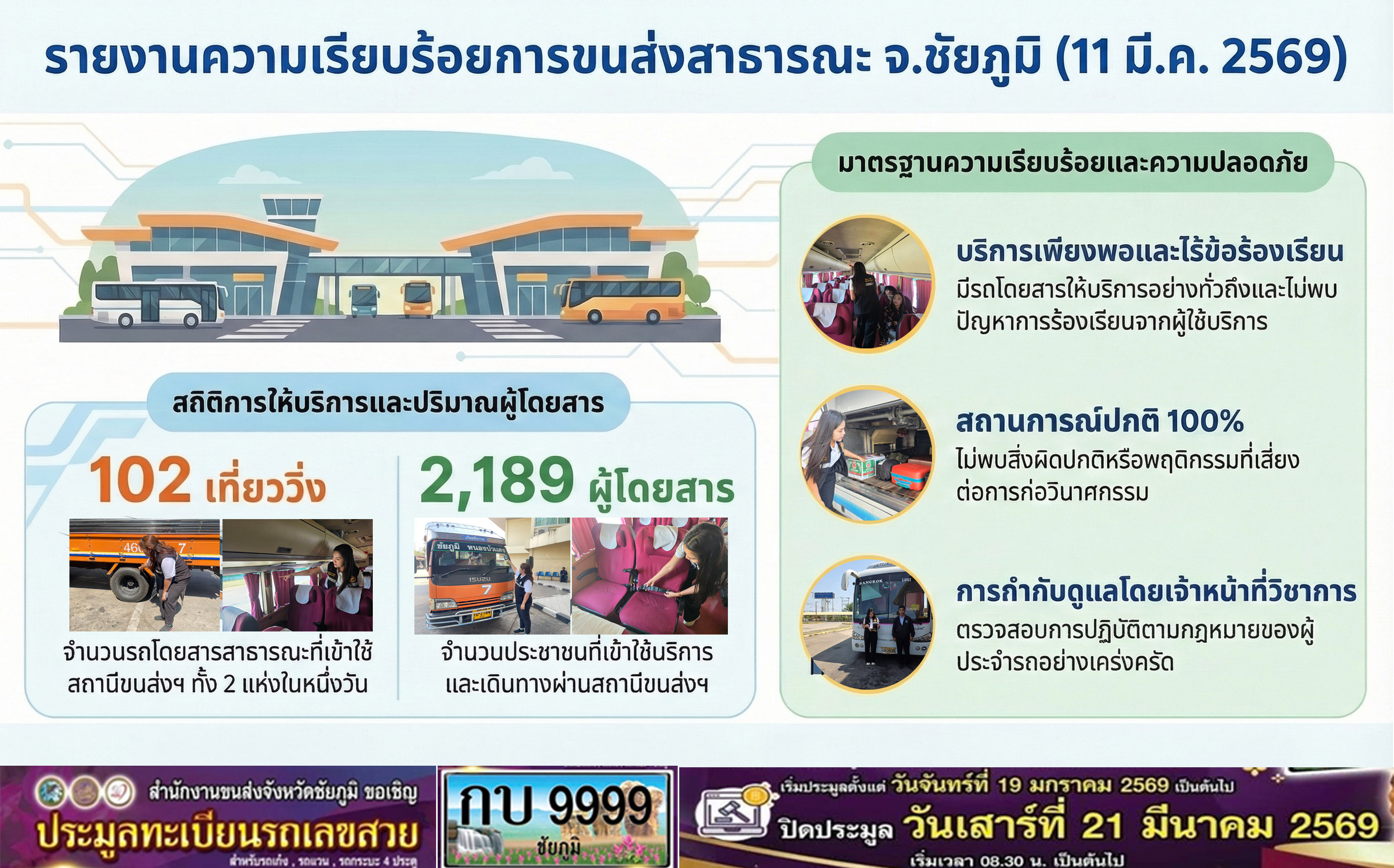 สำนักงานขนส่งจังหวัดชัยภูมิ ดำเนินการกำกับ ดูแล การจัดการเดินรถโดยสารสาธารณะ ณ สถานีขนส่งผู้โดยสารจังหวัดชัยภูมิ  เพื่อให้ผู้ประกอบการขนส่ง และผู้ประจำรถปฏิบัติตามกฎหมาย รวมทั้งดูแลอำนวยความสะดวก ให้คำแนะนำในการเดินทาง และดูแลความปลอดภัยให้แก่ผู้โดยสารที่เข้าใช้บริการสถานีขนส่งผู้โดยสาร สถานการณ์โดยรวมเหตุการณ์ปกติ มีรถโดยสารให้บริการประชาชนเพียงพอ และไม่มีเรื่องร้องเรียนเกี่ยวกับรถโดยสารสาธารณะ