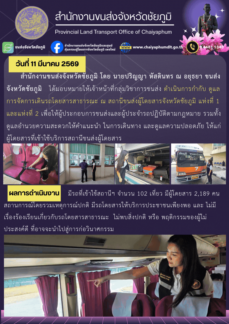 ดำเนินการกำกับ ดูแล การจัดการเดินรถโดยสารสาธารณะ ณ สถานีขนส่งผู้โดยสารจังหวัดชัยภูมิ