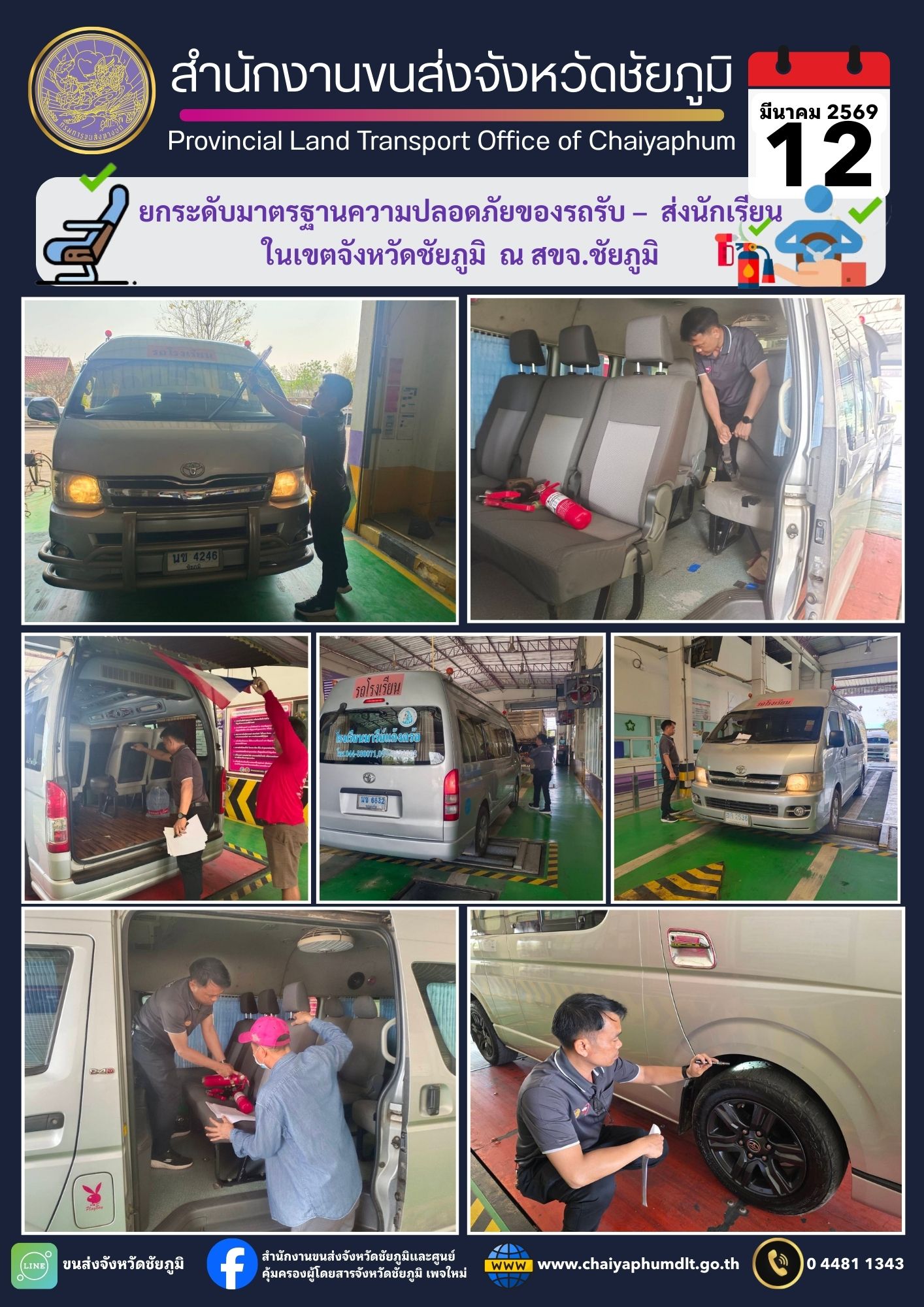 สำนักงานขนส่งจังหวัดชัยภูมิ โดย นายปริญญา หัสดินทร ณ อยุธยา ขนส่งจังหวัดชัยภูมิ  มอบหมายให้เจ้าหน้าที่สำนักงานขนส่งจังหวัดชัยภูมิ และ สาขา ลงพื้นที่ออกประชาสัมพันธ์ในการยกระดับมาตรฐานความปลอดภัยของรถรับ – ส่งนักเรียนในเขตจังหวัดชัยภูมิ  พร้อมทั้ง อำนวยความสะดวกแก่ผู้ประกอบการรถรับ-ส่งนักเรียน  ในการนำรถเข้ารับการตรวจสภาพรถ ได้แก่ ระบบห้ามล้อ ระบบบังคับเลี้ยว เบาะที่นั่ง อุปกรณ์ส่วนควบ ความมั่นคงแข็งแรงของตัวรถ และอุปกรณ์ความปลอดภัยต่างๆ ณ ฝ่ายตรวจสภาพรถ สำนักงานขนส่งจังหวัดชัยภูมิ และสาขา