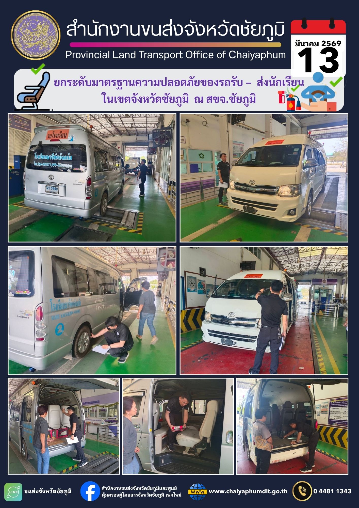 สำนักงานขนส่งจังหวัดชัยภูมิ โดย นายปริญญา หัสดินทร ณ อยุธยา ขนส่งจังหวัดชัยภูมิ มอบหมายให้เจ้าหน้าที่สำนักงานขนส่งจังหวัดชัยภูมิ และ สาขา ลงพื้นที่ออกประชาสัมพันธ์ในการยกระดับมาตรฐานความปลอดภัยของรถรับ – ส่งนักเรียนในเขตจังหวัดชัยภูมิ พร้อมทั้ง อำนวยความสะดวกแก่ผู้ประกอบการรถรับ-ส่งนักเรียน ในการนำรถเข้ารับการตรวจสภาพรถ ได้แก่ ระบบห้ามล้อ ระบบบังคับเลี้ยว เบาะที่นั่ง อุปกรณ์ส่วนควบ ความมั่นคงแข็งแรงของตัวรถ และอุปกรณ์ความปลอดภัยต่างๆ ณ ฝ่ายตรวจสภาพรถ สำนักงานขนส่งจังหวัดชัยภูมิ และสาขา