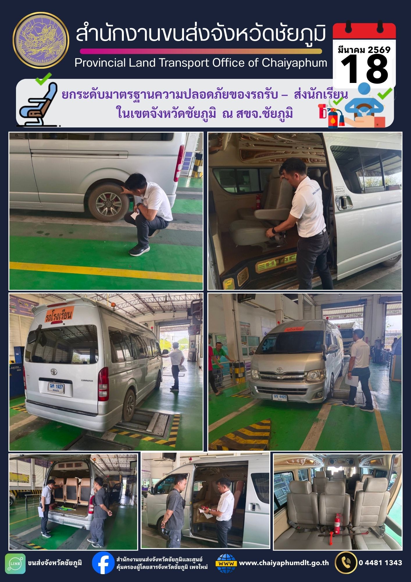 สำนักงานขนส่งจังหวัดชัยภูมิ โดย นายปริญญา หัสดินทร ณ อยุธยา ขนส่งจังหวัดชัยภูมิ มอบหมายให้เจ้าหน้าที่สำนักงานขนส่งจังหวัดชัยภูมิ และ สาขา ลงพื้นที่ออกประชาสัมพันธ์ในการยกระดับมาตรฐานความปลอดภัยของรถรับ – ส่งนักเรียนในเขตจังหวัดชัยภูมิ พร้อมทั้ง อำนวยความสะดวกแก่ผู้ประกอบการรถรับ-ส่งนักเรียน ในการนำรถเข้ารับการตรวจสภาพรถ ได้แก่ ระบบห้ามล้อ ระบบบังคับเลี้ยว เบาะที่นั่ง อุปกรณ์ส่วนควบ ความมั่นคงแข็งแรงของตัวรถ และอุปกรณ์ความปลอดภัยต่างๆ ณ ฝ่ายตรวจสภาพรถ สำนักงานขนส่งจังหวัดชัยภูมิ และสาขา