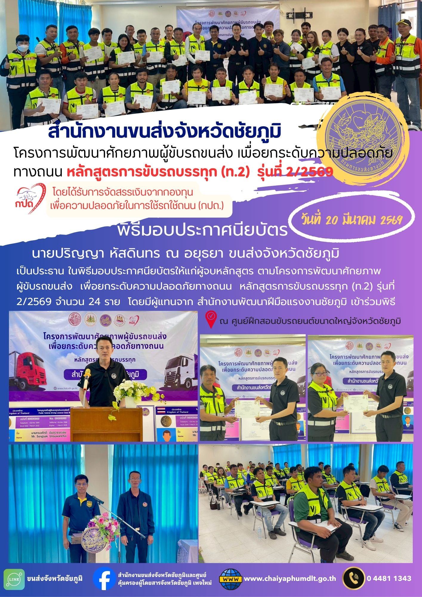 สำนักงานขนส่งจังหวัดชัยภูมิ โดย นายปริญญา หัสดินทร ณ อยุธยา ขนส่งจังหวัดชัยภูมิ เป็นประธาน ในพิธีมอบประกาศนียบัตรให้แก่ผู้จบหลักสูตร ตามโครงการพัฒนาศักยภาพผู้ขับรถขนส่ง เพื่อยกระดับความปลอดภัยทางถนน หลักสูตรการขับรถบรรทุก (ท.2) รุ่นที่ 2/2569 จำนวน 24 ราย ณ ศูนย์ฝึกสอนขับรถยนต์ขนาดใหญ่จังหวัดชัยภูมิ โดยมีผู้แทนจากสำนักงานพัฒนาฝีมือแรงงานชัยภูมิ เข้าร่วมพิธีปิดฯ ซึ่งโครงการดังกล่าว โดยได้รับการจัดสรรเงินจากกองทุนเพื่อความปลอดภัยในการใช้รถใช้ถนน (กปถ.)