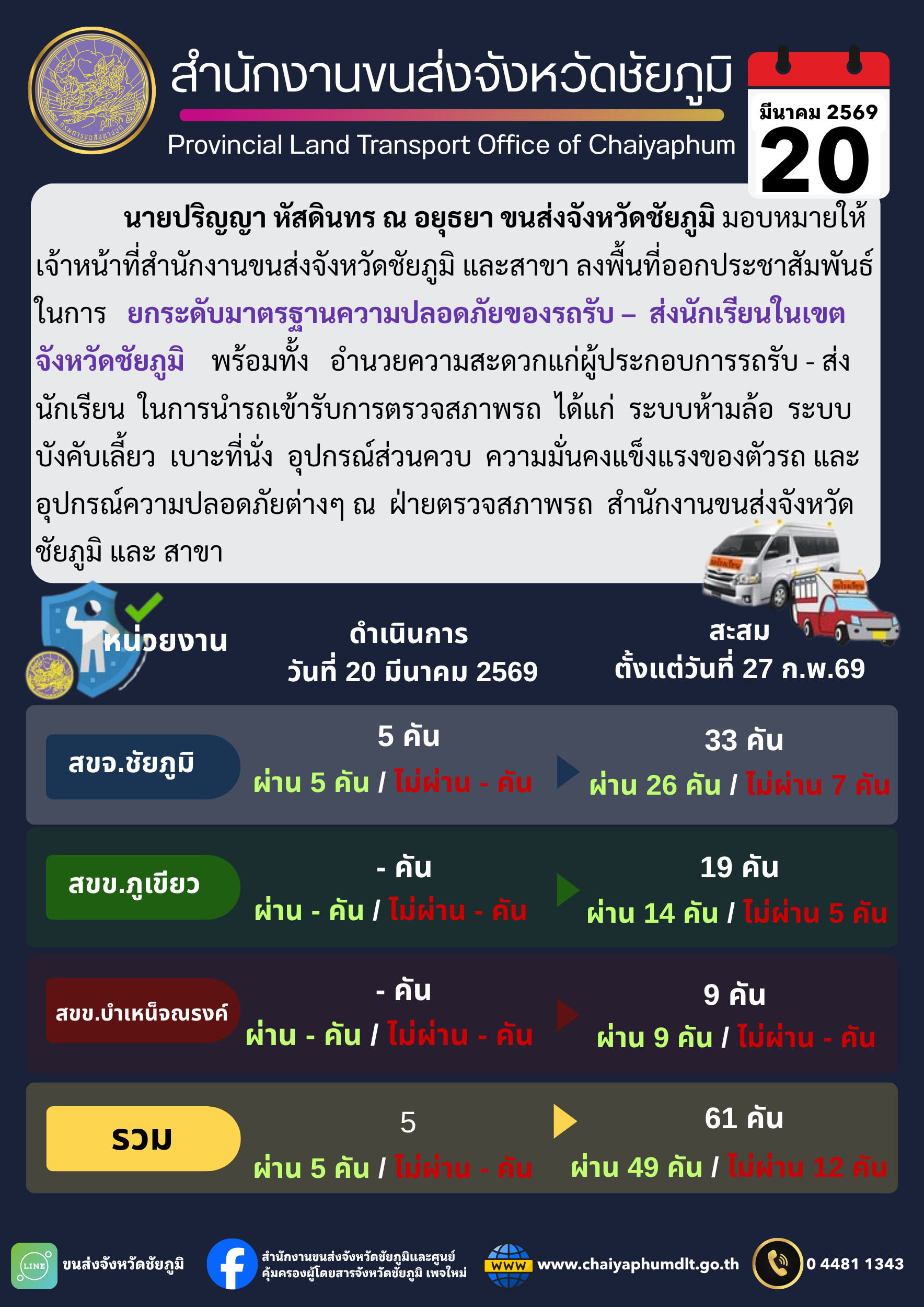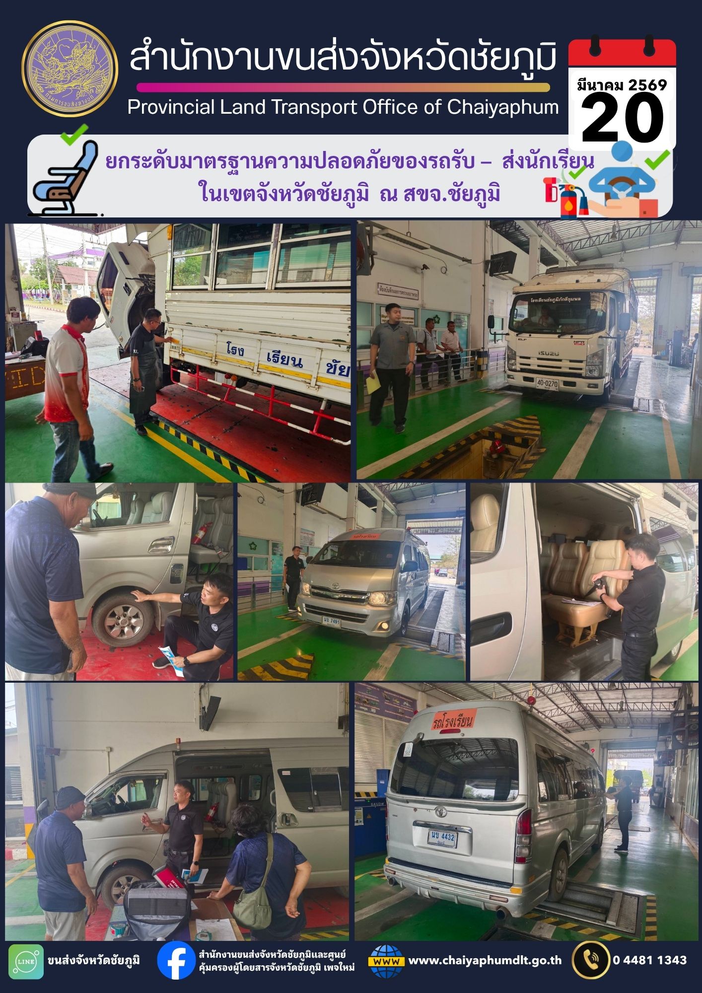 สำนักงานขนส่งจังหวัดชัยภูมิ โดย นายปริญญา หัสดินทร ณ อยุธยา ขนส่งจังหวัดชัยภูมิ มอบหมายให้เจ้าหน้าที่สำนักงานขนส่งจังหวัดชัยภูมิ และ สาขา ลงพื้นที่ออกประชาสัมพันธ์ในการยกระดับมาตรฐานความปลอดภัยของรถรับ – ส่งนักเรียนในเขตจังหวัดชัยภูมิ พร้อมทั้ง อำนวยความสะดวกแก่ผู้ประกอบการรถรับ-ส่งนักเรียน ในการนำรถเข้ารับการตรวจสภาพรถ ได้แก่ ระบบห้ามล้อ ระบบบังคับเลี้ยว เบาะที่นั่ง อุปกรณ์ส่วนควบ ความมั่นคงแข็งแรงของตัวรถ และอุปกรณ์ความปลอดภัยต่างๆ ณ ฝ่ายตรวจสภาพรถ สำนักงานขนส่งจังหวัดชัยภูมิ และสาขา