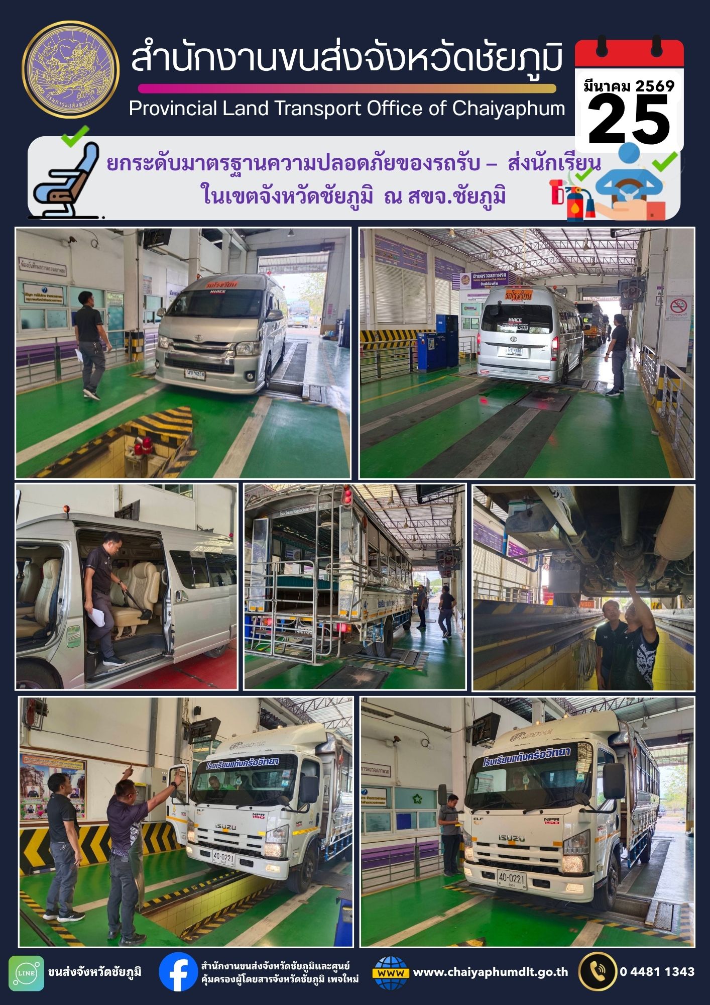 สำนักงานขนส่งจังหวัดชัยภูมิ โดย นายปริญญา หัสดินทร ณ อยุธยา ขนส่งจังหวัดชัยภูมิ มอบหมายให้เจ้าหน้าที่สำนักงานขนส่งจังหวัดชัยภูมิ และ สาขา ลงพื้นที่ออกประชาสัมพันธ์ในการยกระดับมาตรฐานความปลอดภัยของรถรับ – ส่งนักเรียนในเขตจังหวัดชัยภูมิ พร้อมทั้ง อำนวยความสะดวกแก่ผู้ประกอบการรถรับ-ส่งนักเรียน ในการนำรถเข้ารับการตรวจสภาพรถ ได้แก่ ระบบห้ามล้อ ระบบบังคับเลี้ยว เบาะที่นั่ง อุปกรณ์ส่วนควบ ความมั่นคงแข็งแรงของตัวรถ และอุปกรณ์ความปลอดภัยต่างๆ ณ ฝ่ายตรวจสภาพรถ สำนักงานขนส่งจังหวัดชัยภูมิ และสาขา