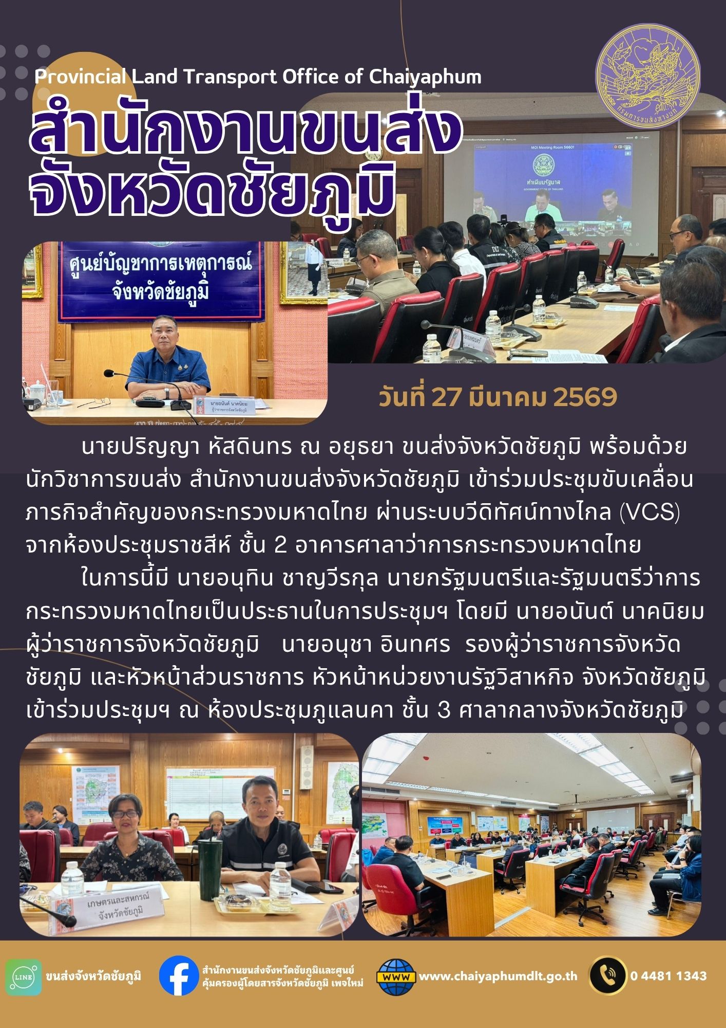 สำนักงานขนส่งจังหวัดชัยภูมิ โดย นายปริญญา หัสดินทร ณ อยุธยา ขนส่งจังหวัดชัยภูมิ พร้อมด้วยนักวิชาการขนส่ง สำนักงานขนส่งจังหวัดชัยภูมิ เข้าร่วมประชุมขับเคลื่อนภารกิจสำคัญของกระทรวงมหาดไทย ผ่านระบบวีดิทัศน์ทางไกล (VCS) จากห้องประชุมราชสีห์ ชั้น 2 อาคารศาลาว่าการกระทรวงมหาดไทย