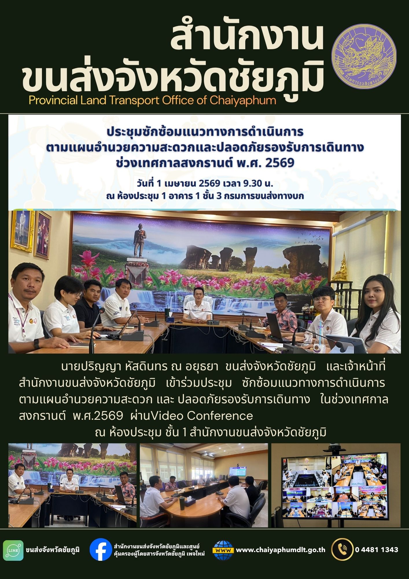 สำนักงานขนส่งจังหวัดชัยภูมิ โดย นายปริญญา หัสดินทร ณ อยุธยา ขนส่งจังหวัดชัยภูมิ และเจ้าหน้าที่สำนักงานขนส่งจังหวัดชัยภูมิ เข้าร่วมประชุมซักซ้อมแนวทางการดำเนินการตามแผนอำนวยความสะดวกและปลอดภัยรองรับการเดินทาง ในช่วงเทศกาลสงกรานต์ พ.ศ.2569 ผ่านVideo Conference ณ ห้องประชุม ชั้น 1 สำนักงานขนส่งจังหวัดชัยภูมิ