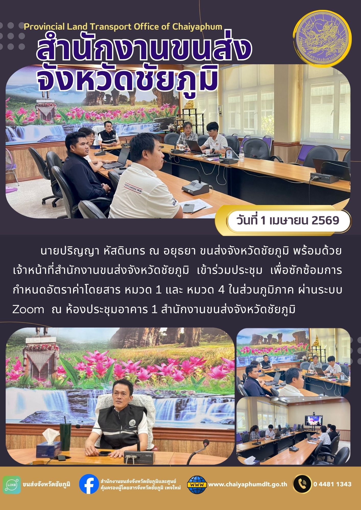 สำนักงานขนส่งจังหวัดชัยภูมิ โดย นายปริญญา หัสดินทร ณ อยุธยา ขนส่งจังหวัดชัยภูมิ พร้อมด้วย เจ้าหน้าที่สำนักงานขนส่งจังหวัดชัยภูมิ เข้าร่วมประชุมเพื่อซักซ้อมการกำหนดอัตราค่าโดยสาร หมวด 1 และ หมวด 4 ในส่วนภูมิภาค ผ่านระบบ Zoom ณ ห้องประชุมอาคาร 1 สำนักงานขนส่งจังหวัดชัยภูมิ