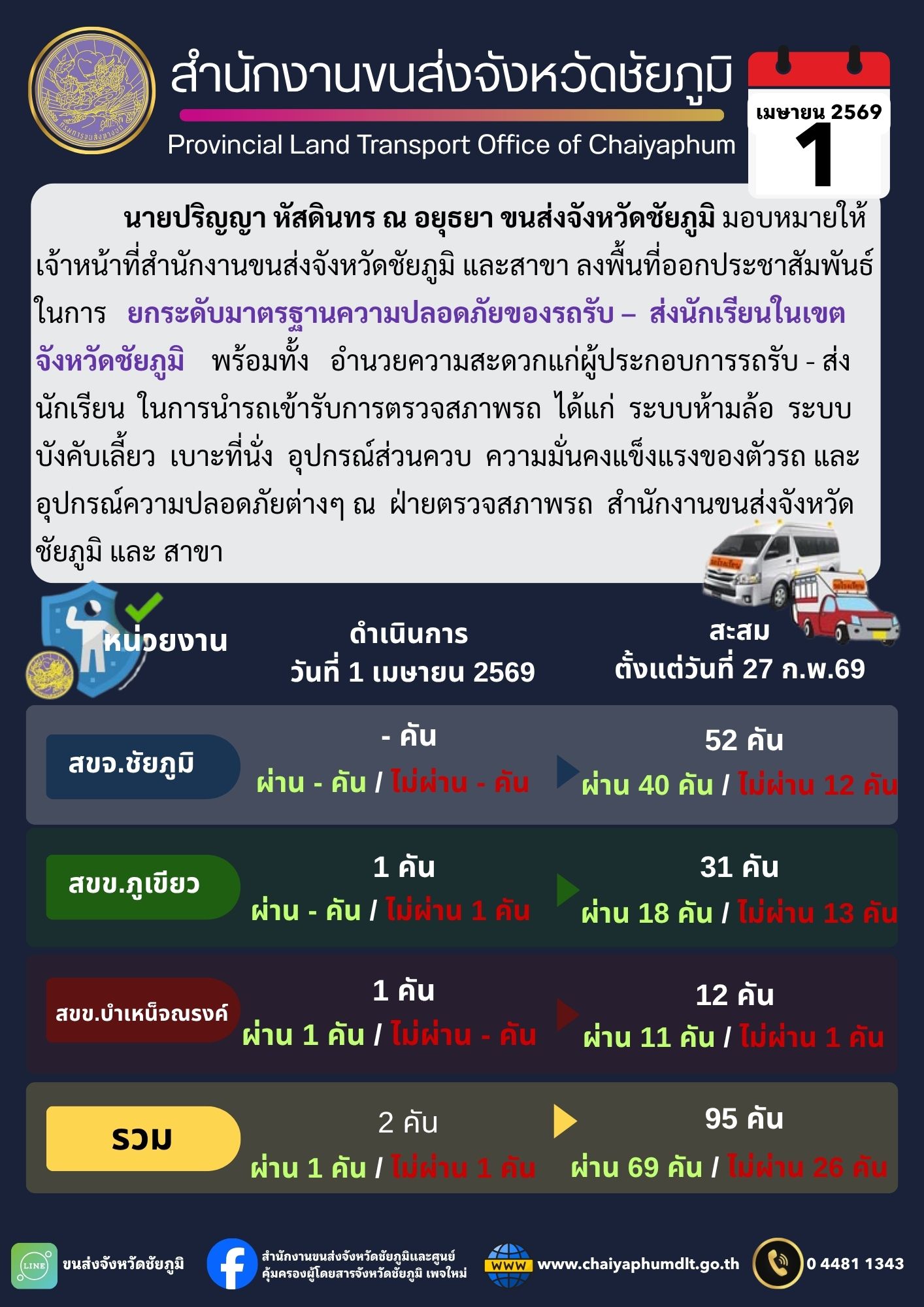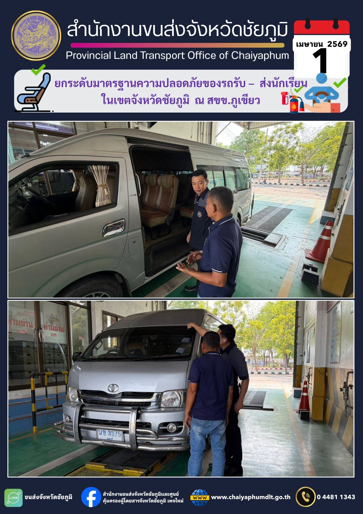 สำนักงานขนส่งจังหวัดชัยภูมิ โดย นายปริญญา หัสดินทร ณ อยุธยา ขนส่งจังหวัดชัยภูมิ มอบหมายให้เจ้าหน้าที่สำนักงานขนส่งจังหวัดชัยภูมิ และ สาขา ลงพื้นที่ออกประชาสัมพันธ์ในการยกระดับมาตรฐานความปลอดภัยของรถรับ – ส่งนักเรียนในเขตจังหวัดชัยภูมิ พร้อมทั้ง อำนวยความสะดวกแก่ผู้ประกอบการรถรับ-ส่งนักเรียน ในการนำรถเข้ารับการตรวจสภาพรถ ได้แก่ ระบบห้ามล้อ ระบบบังคับเลี้ยว เบาะที่นั่ง อุปกรณ์ส่วนควบ ความมั่นคงแข็งแรงของตัวรถ และอุปกรณ์ความปลอดภัยต่างๆ ณ ฝ่ายตรวจสภาพรถ สำนักงานขนส่งจังหวัดชัยภูมิ และสาขา