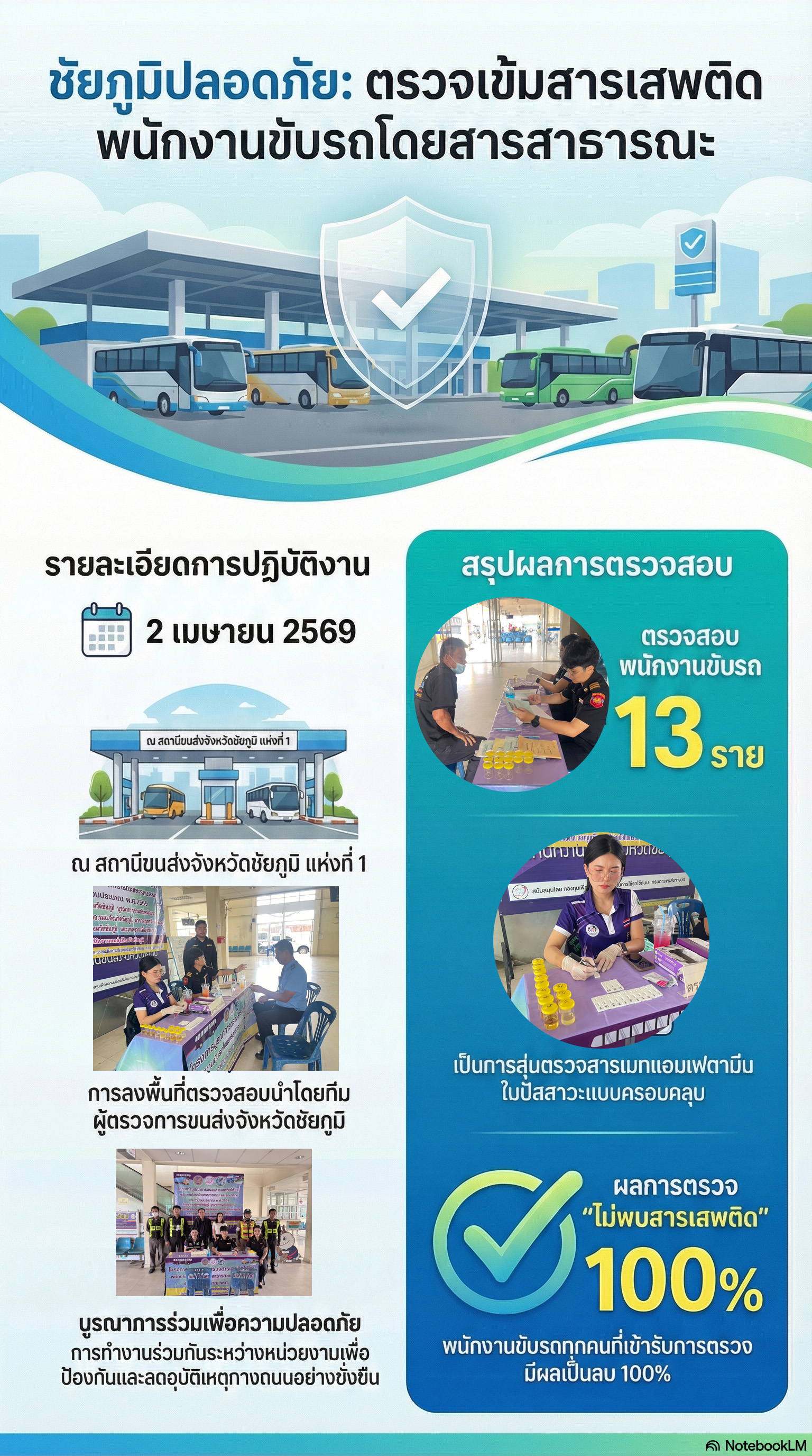 สำนักงานขนส่งจังหวัดชัยภูมิ โดย นายปริญญา หัสดินทร ณ อยุธยา ขนส่งจังหวัดชัยภูมิ ได้มอบหมายให้ผู้ตรวจการตั้งจุดตรวจสอบสารเสพติดให้โทษ (เมทแอมเฟตามีน) ในปัสสาวะของพนักงานขับรถโดยสารสาธารณะ เพื่อป้องกันและลดอุบัติเหตุทางถนน ณ บริเวณสถานีขนส่งผู้โดยสารจังหวัดชัยภูมิ แห่งที่ 1 โดยบูรณาการร่วมกับหน่วยงานที่เกี่ยวข้องในจังหวัดชัยภูมิ