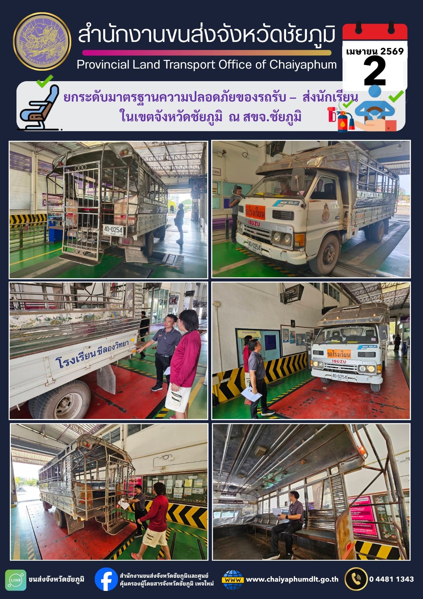 สำนักงานขนส่งจังหวัดชัยภูมิ โดย นายปริญญา หัสดินทร ณ อยุธยา ขนส่งจังหวัดชัยภูมิ มอบหมายให้เจ้าหน้าที่สำนักงานขนส่งจังหวัดชัยภูมิ และ สาขา ลงพื้นที่ออกประชาสัมพันธ์ในการยกระดับมาตรฐานความปลอดภัยของรถรับ – ส่งนักเรียนในเขตจังหวัดชัยภูมิ พร้อมทั้ง อำนวยความสะดวกแก่ผู้ประกอบการรถรับ-ส่งนักเรียน ในการนำรถเข้ารับการตรวจสภาพรถ ได้แก่ ระบบห้ามล้อ ระบบบังคับเลี้ยว เบาะที่นั่ง อุปกรณ์ส่วนควบ ความมั่นคงแข็งแรงของตัวรถ และอุปกรณ์ความปลอดภัยต่างๆ ณ ฝ่ายตรวจสภาพรถ สำนักงานขนส่งจังหวัดชัยภูมิ และสาขา