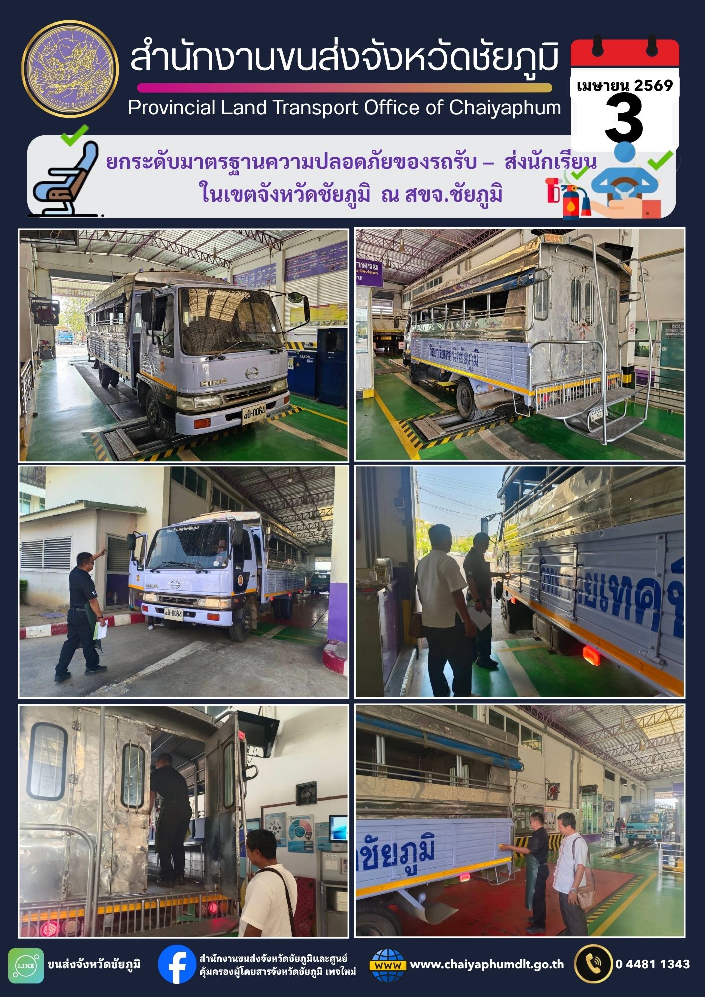 สำนักงานขนส่งจังหวัดชัยภูมิ โดย นายปริญญา หัสดินทร ณ อยุธยา ขนส่งจังหวัดชัยภูมิ มอบหมายให้เจ้าหน้าที่สำนักงานขนส่งจังหวัดชัยภูมิ และ สาขา ลงพื้นที่ออกประชาสัมพันธ์ในการยกระดับมาตรฐานความปลอดภัยของรถรับ – ส่งนักเรียนในเขตจังหวัดชัยภูมิ พร้อมทั้ง อำนวยความสะดวกแก่ผู้ประกอบการรถรับ-ส่งนักเรียน ในการนำรถเข้ารับการตรวจสภาพรถ ได้แก่ ระบบห้ามล้อ ระบบบังคับเลี้ยว เบาะที่นั่ง อุปกรณ์ส่วนควบ ความมั่นคงแข็งแรงของตัวรถ และอุปกรณ์ความปลอดภัยต่างๆ ณ ฝ่ายตรวจสภาพรถ สำนักงานขนส่งจังหวัดชัยภูมิ และสาขา