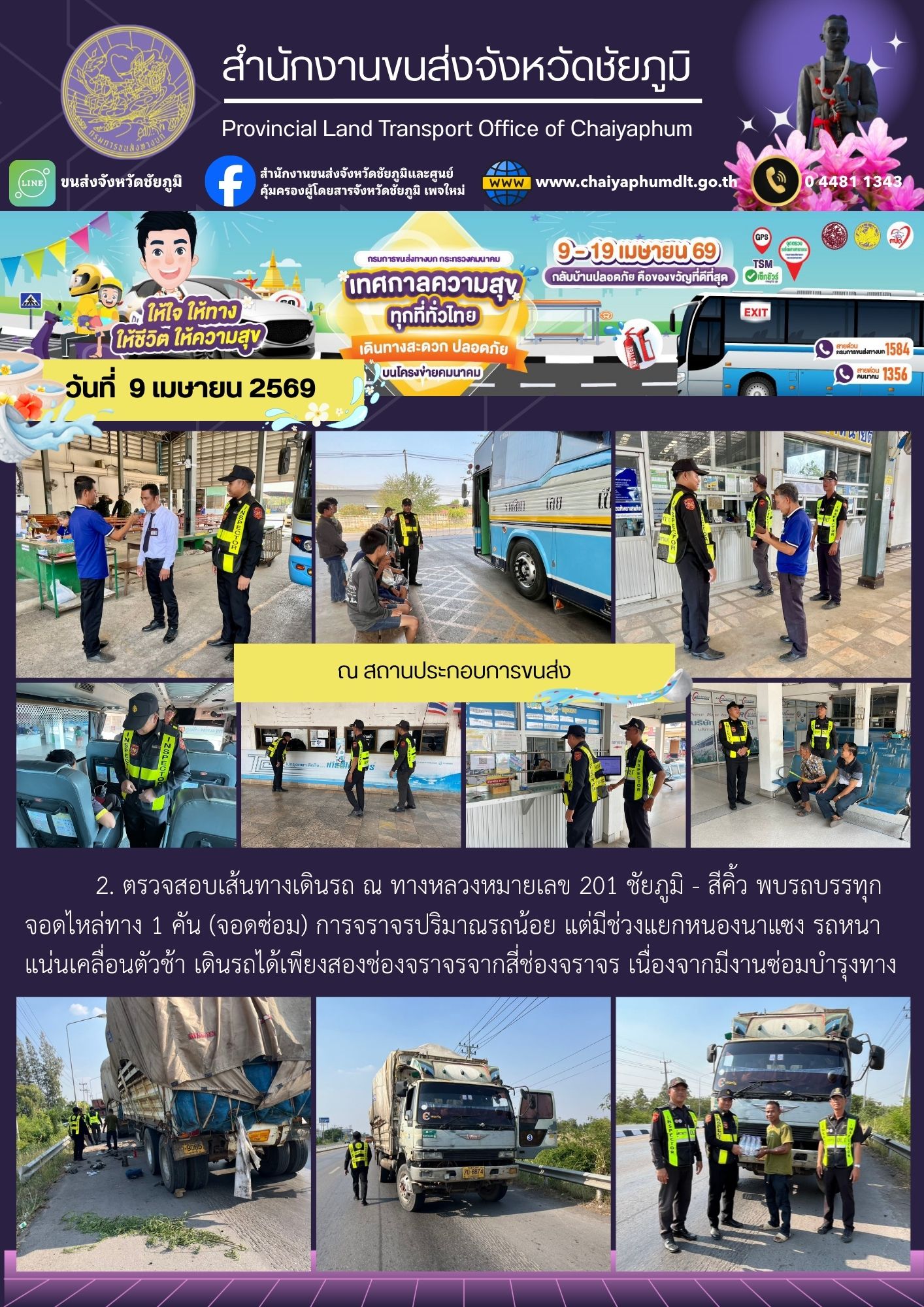 สำนักงานขนส่งจังหวัดชัยภูมิ โดย นายปริญญา หัสดินทร ณ อยุธยา ขนส่งจังหวัดชัยภูมิ มอบหมายให้ ชุดเคลื่อนที่เร็วออกปฏิบัติงานตามแผนอำนวยความสะดวกและความปลอดภัย รองรับการเดินทางของประชาชน ในช่วงเทศกาลสงกรานต์ 2569 ระหว่างวันที่ 9-19 เมษายน 2569