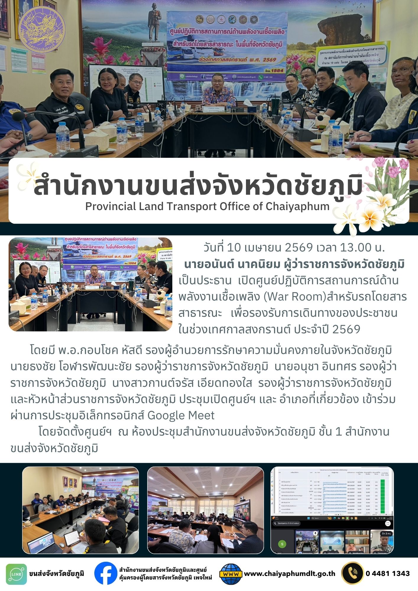 วันที่ 10 เมษายน 2569 เวลา 13.00 น. นายอนันต์ นาคนิยม ผู้ว่าราชการจังหวัดชัยภูมิ เป็นประธานเปิดศูนย์ปฏิบัติการสถานการณ์ด้านพลังงานเชื้อเพลิง (War Room) สำหรับรถโดยสารสาธารณะ เพื่อรองรับการเดินทางของประชาชนในช่วงเทศกาลสงกรานต์ ประจำปี 2569 โดยมี พ.อ.กอบโชค หัสดี รองผู้อำนวยการรักษาความมั่นคงภายในจังหวัดชัยภูมิ นายธงชัย โอฬารพัฒนะชัย รองผู้ว่าราชการจังหวัดชัยภูมิ นายอนุชา อินทศร รองผู้ว่าราชการจังหวัดชัยภูมิ นางสาวกานต์จรัส เอียดทองใส รองผู้ว่าราชการจังหวัดชัยภูมิ และหัวหน้าส่วนราชการจังหวัดชัยภูมิ ประชุมเปิดศูนย์ฯ และอำเภอที่เกี่ยวข้องเข้าร่วมผ่านการประชุมอิเล็กทรอนิกส์ Google Meet โดยจัดตั้งศูนย์ฯ ณ ห้องประชุมสำนักงานขนส่งจังหวัดชัยภูมิ ชั้น 1 สำนักงานขนส่งจังหวัดชัยภูมิ