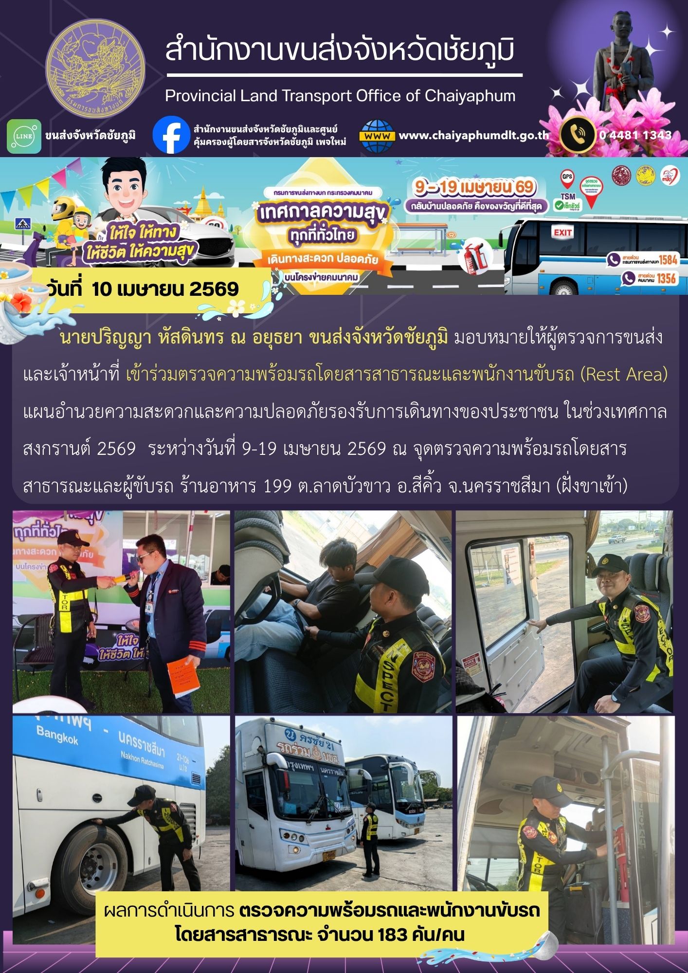 สำนักงานขนส่งจังหวัดชัยภูมิ โดย นายปริญญา หัสดินทร ณ อยุธยา ขนส่งจังหวัดชัยภูมิ มอบหมายให้ผู้ตรวจการขนส่งและเจ้าหน้าที่ เข้าร่วมตรวจความพร้อมรถโดยสารสาธารณะและพนักงานขับรถ (Rest Area) แผนอำนวยความสะดวกและความปลอดภัย รองรับการเดินทางของประชาชน ในช่วงเทศกาลสงกรานต์ 2569 ระหว่างวันที่ 9-19 เมษายน 2569 ณ จุดตรวจความพร้อมรถโดยสารสาธารณะและผู้ขับรถ ร้านอาหาร 199 ต.ลาดบัวขาว อ.สีคิ้ว จ.นครราชสีมา (ฝั่งขาเข้า)