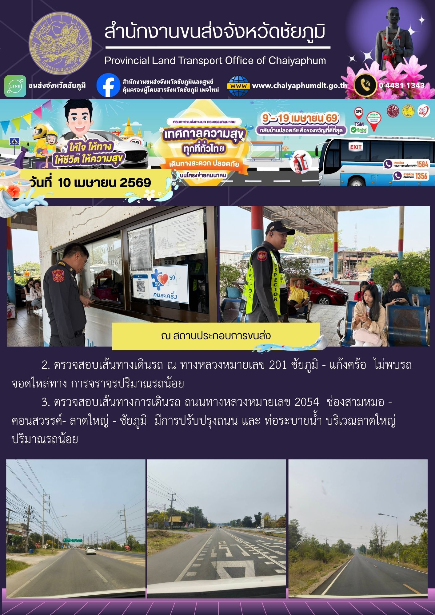 สำนักงานขนส่งจังหวัดชัยภูมิ โดย นายปริญญา หัสดินทร ณ อยุธยา ขนส่งจังหวัดชัยภูมิ มอบหมายให้ชุดเคลื่อนที่เร็วออกปฏิบัติงานตามแผนอำนวยความสะดวกฯ จึงขอรายงานผลการปฏิบัติงาน ดังนี้