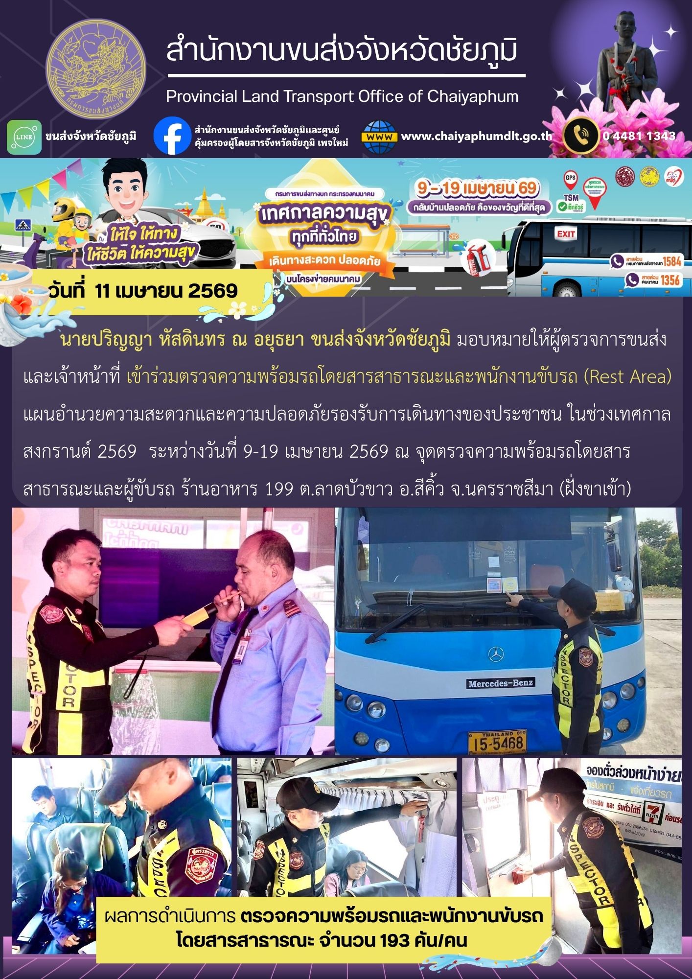 สำนักงานขนส่งจังหวัดชัยภูมิ โดย นายปริญญา หัสดินทร ณ อยุธยา ขนส่งจังหวัดชัยภูมิ มอบหมายให้ผู้ตรวจการขนส่งและเจ้าหน้าที่ เข้าร่วมตรวจความพร้อมรถโดยสารสาธารณะและพนักงานขับรถ (Rest Area) แผนอำนวยความสะดวกและความปลอดภัย รองรับการเดินทางของประชาชน ในช่วงเทศกาลสงกรานต์ 2569 ระหว่างวันที่ 9-19 เมษายน 2569 ณ จุดตรวจความพร้อมรถโดยสารสาธารณะและผู้ขับรถ ร้านอาหาร 199 ต.ลาดบัวขาว อ.สีคิ้ว จ.นครราชสีมา (ฝั่งขาเข้า)