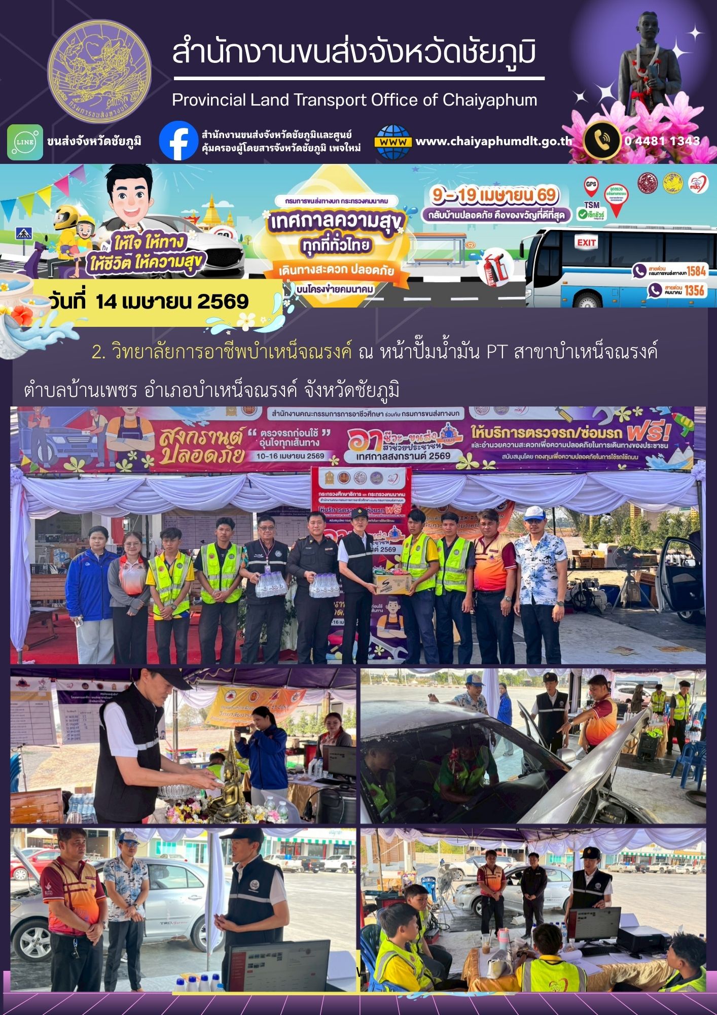 สำนักงานขนส่งจังหวัดชัยภูมิ โดย นายปริญญา หัสดินทร ณ อยุธยา ขนส่งจังหวัดชัยภูมิ ลงพื้นที่ตรวจจุดบริการ“อาชีวะ - ขนส่ง อาสาช่วยประชาชน” เพื่อให้กำลังใจ คณะครู นักเรียน นักศึกษา ที่ปฏิบัติหน้าที่ช่วงเทศกาลสงกรานต์ 2569 ดังนี้