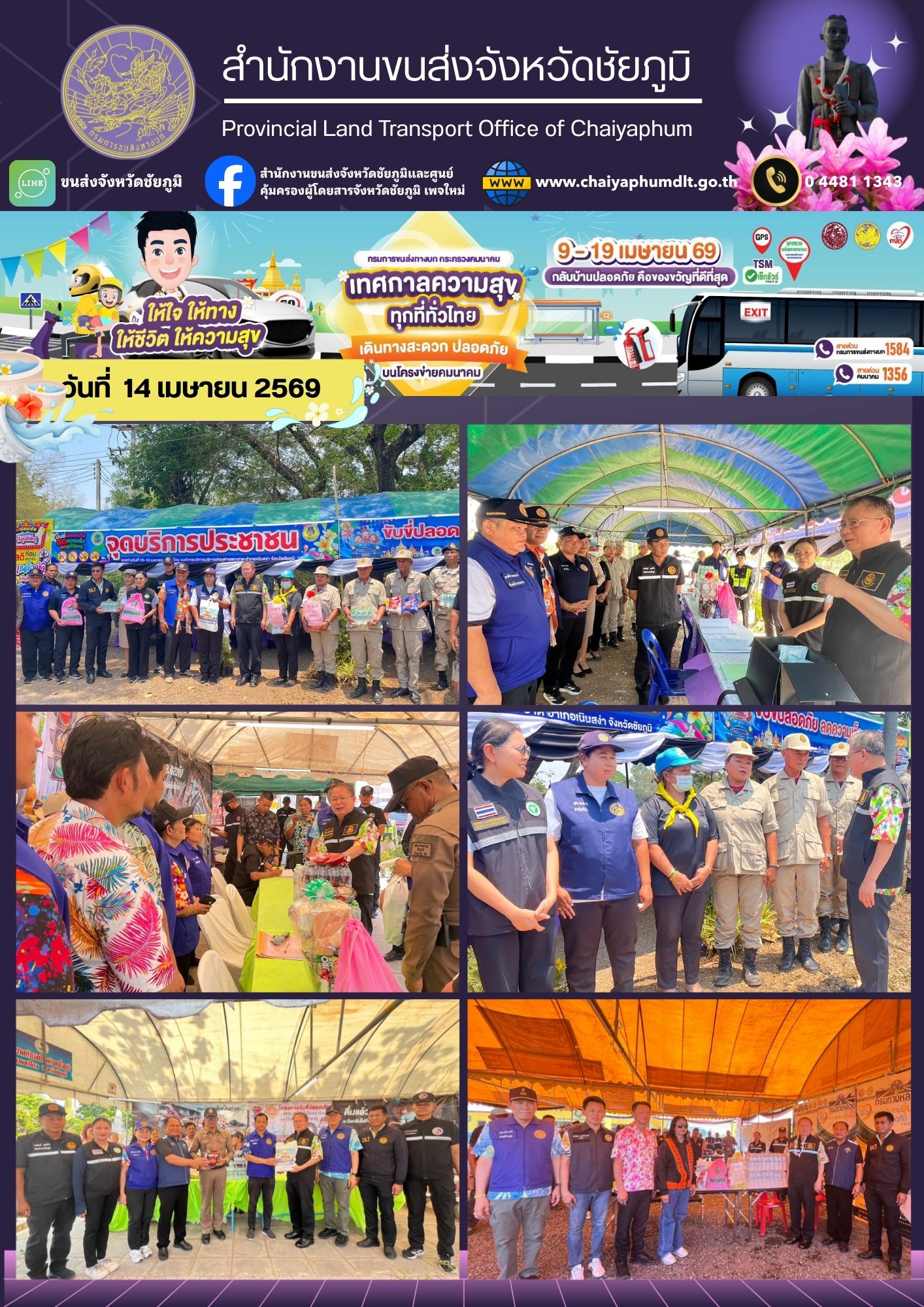 นายอนันต์ นาคนิยม ผู้ว่าราชการจังหวัดชัยภูมิ มอบหมายให้ หัวหน้าส่วนราชการจังหวัดชัยภูมิ ลงพื้นที่ตรวจเยี่ยม ให้กำลังใจผู้ปฏิบัติงาน จุดตรวจ / จุดบริการ และด่านชุมชน ในช่วงเทศกาลสงกรานต์ พ.ศ.2569 โดยมี นายธงชัย โอฬารพัฒนะชัย รองผู้ว่าราชการจังหวัดชัยภูมิ พร้อมด้วย หัวหน้าส่วนราชการ ร่วมคณะลงพื้นที่จุดตรวจอำเภอเมืองชัยภูมิ จุดตรวจเนินสง่า จุดตรวจซับใหญ่ จุดตรวจหนองบัวโคก จุดตรวจจัตุรัส และจุดตรวจบ้านเขว้า ในการนี้ สำนักงานขนส่งจังหวัดชัยภูมิ โดย นายปริญญา หัสดินทร ณ อยุธยา ได้มอบหมายให้ จ่าเอกโชติวงศ์ ทะมาดี หัวหน้ากลุ่มวิชาการขนส่ง ร่วมออกตรวจเยี่ยม