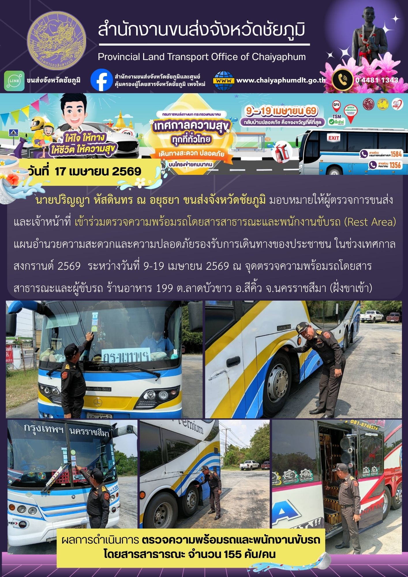 สำนักงานขนส่งจังหวัดชัยภูมิ โดย นายปริญญา หัสดินทร ณ อยุธยา ขนส่งจังหวัดชัยภูมิ มอบหมายให้ผู้ตรวจการขนส่งและเจ้าหน้าที่ เข้าร่วมตรวจความพร้อมรถโดยสารสาธารณะและพนักงานขับรถ (Rest Area) แผนอำนวยความสะดวกและความปลอดภัย รองรับการเดินทางของประชาชน ในช่วงเทศกาลสงกรานต์ 2569 ระหว่างวันที่ 9-19 เมษายน 2569 ณ จุดตรวจความพร้อมรถโดยสารสาธารณะและผู้ขับรถ ร้านอาหาร 199 ต.ลาดบัวขาว อ.สีคิ้ว จ.นครราชสีมา (ฝั่งขาเข้า)