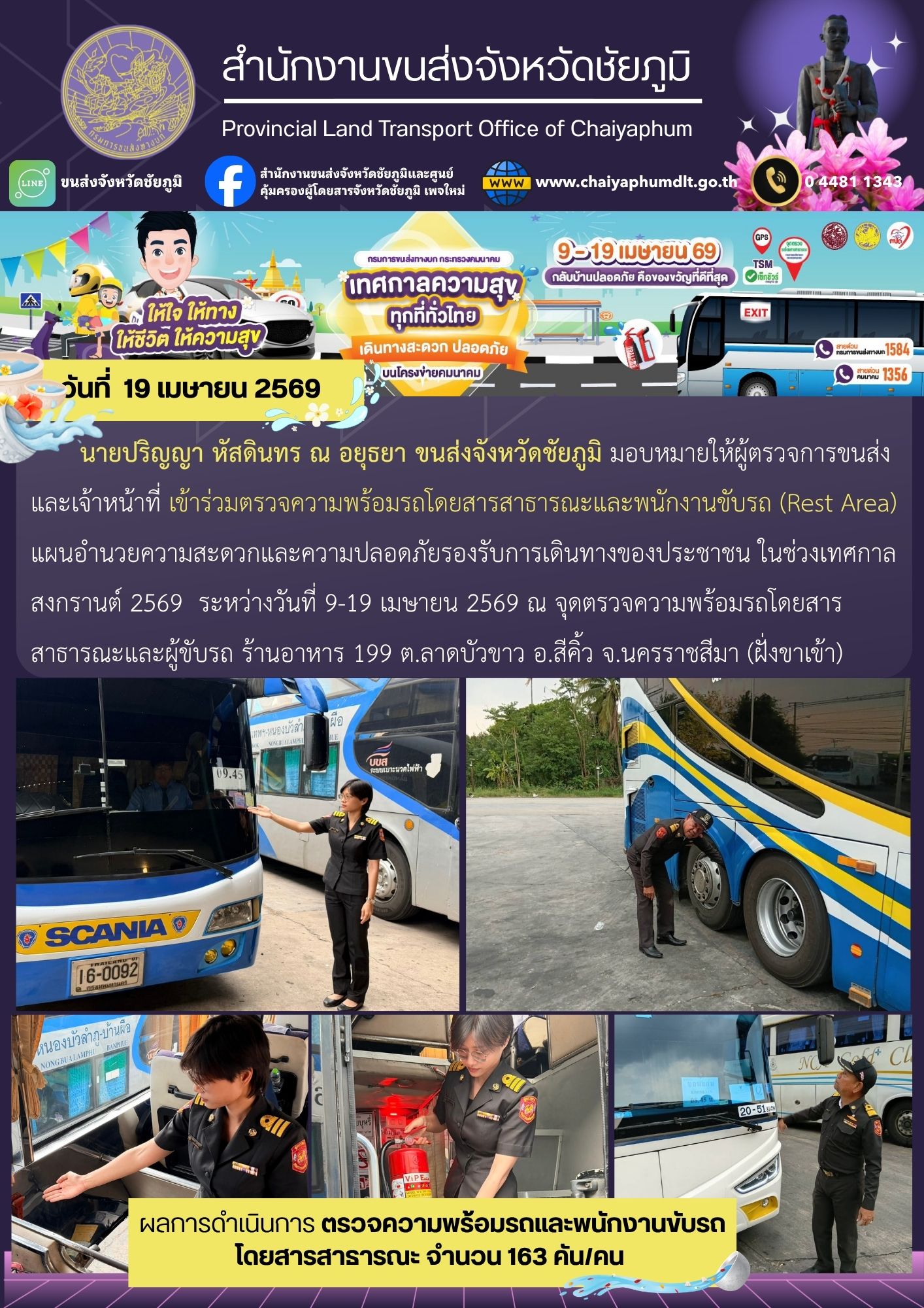 สำนักงานขนส่งจังหวัดชัยภูมิ โดย นายปริญญา หัสดินทร ณ อยุธยา ขนส่งจังหวัดชัยภูมิ มอบหมายให้ผู้ตรวจการขนส่งและเจ้าหน้าที่ เข้าร่วมตรวจความพร้อมรถโดยสารสาธารณะและพนักงานขับรถ (Rest Area) แผนอำนวยความสะดวกและความปลอดภัย รองรับการเดินทางของประชาชน ในช่วงเทศกาลสงกรานต์ 2569 ระหว่างวันที่ 9-19 เมษายน 2569 ณ จุดตรวจความพร้อมรถโดยสารสาธารณะและผู้ขับรถ ร้านอาหาร 199 ต.ลาดบัวขาว อ.สีคิ้ว จ.นครราชสีมา (ฝั่งขาเข้า)