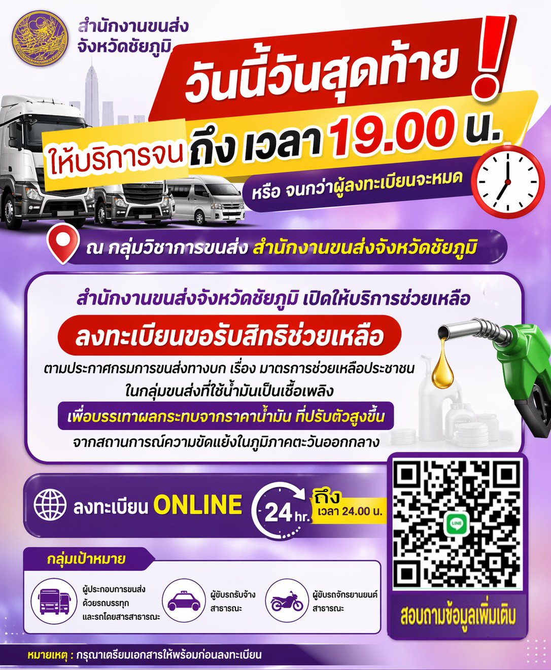 วันนี้วันสุดท้าย ของการรับลงทะเบียน ขอรับสิทธิช่วยเหลือ ตามประกาศกรมการขนส่งทางบก เรื่อง มาตรการช่วยเหลือประชาชนในกลุ่มขนส่งที่ใช้น้ำมันเป็นเชื้อเพลิง เพื่อบรรเทาผลกระทบจากราคาน้ำมัน ที่ปรับตัวสูงขึ้น จากสถานการณ์ความขัดแย้งในภูมิภาคตะวันออกกลาง