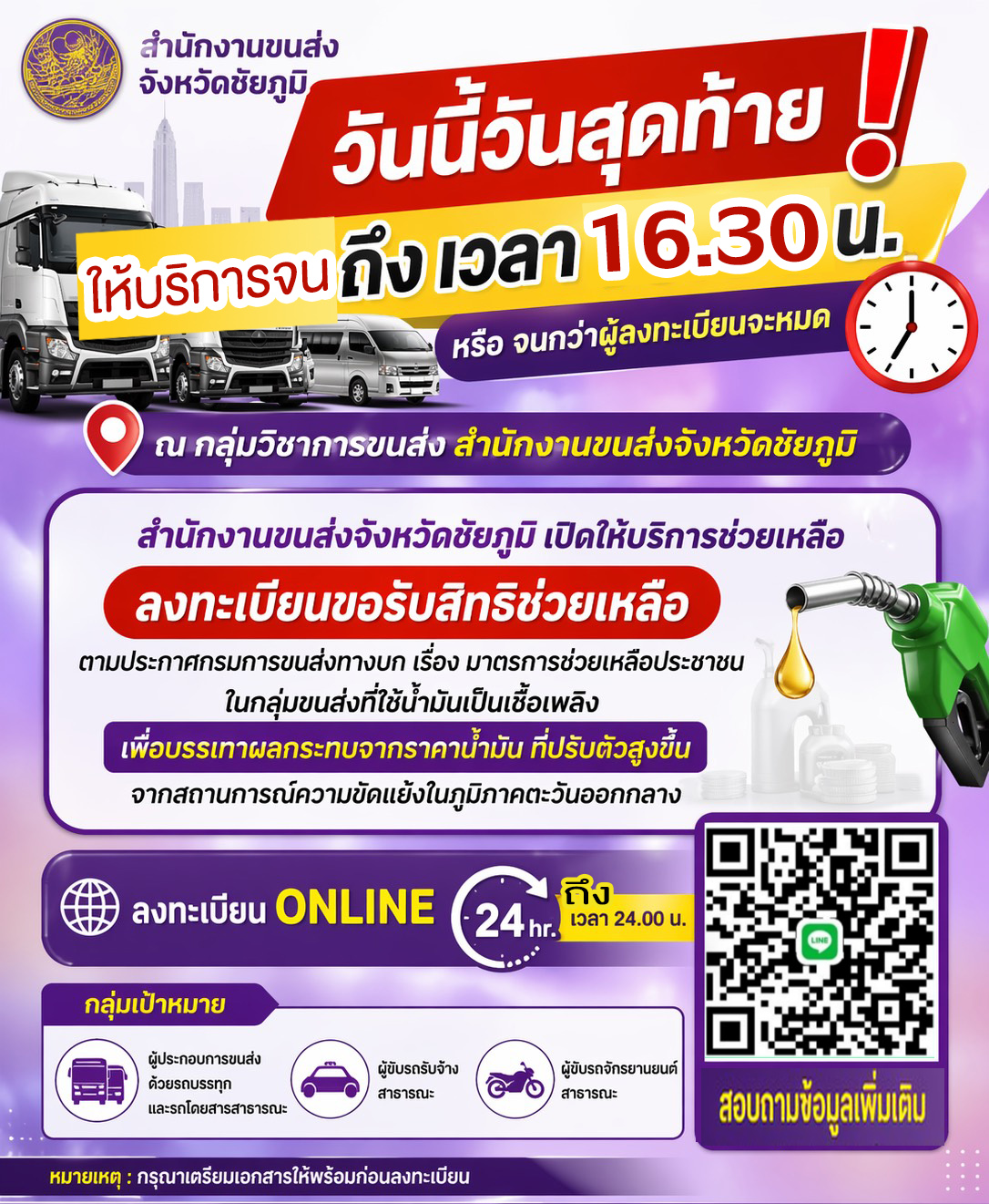 วันนี้วันสุดท้าย ของการรับลงทะเบียน ขอรับสิทธิช่วยเหลือ ตามประกาศกรมการขนส่งทางบก เรื่อง มาตรการช่วยเหลือประชาชนในกลุ่มขนส่งที่ใช้น้ำมันเป็นเชื้อเพลิง เพื่อบรรเทาผลกระทบจากราคาน้ำมัน ที่ปรับตัวสูงขึ้น จากสถานการณ์ความขัดแย้งในภูมิภาคตะวันออกกลาง