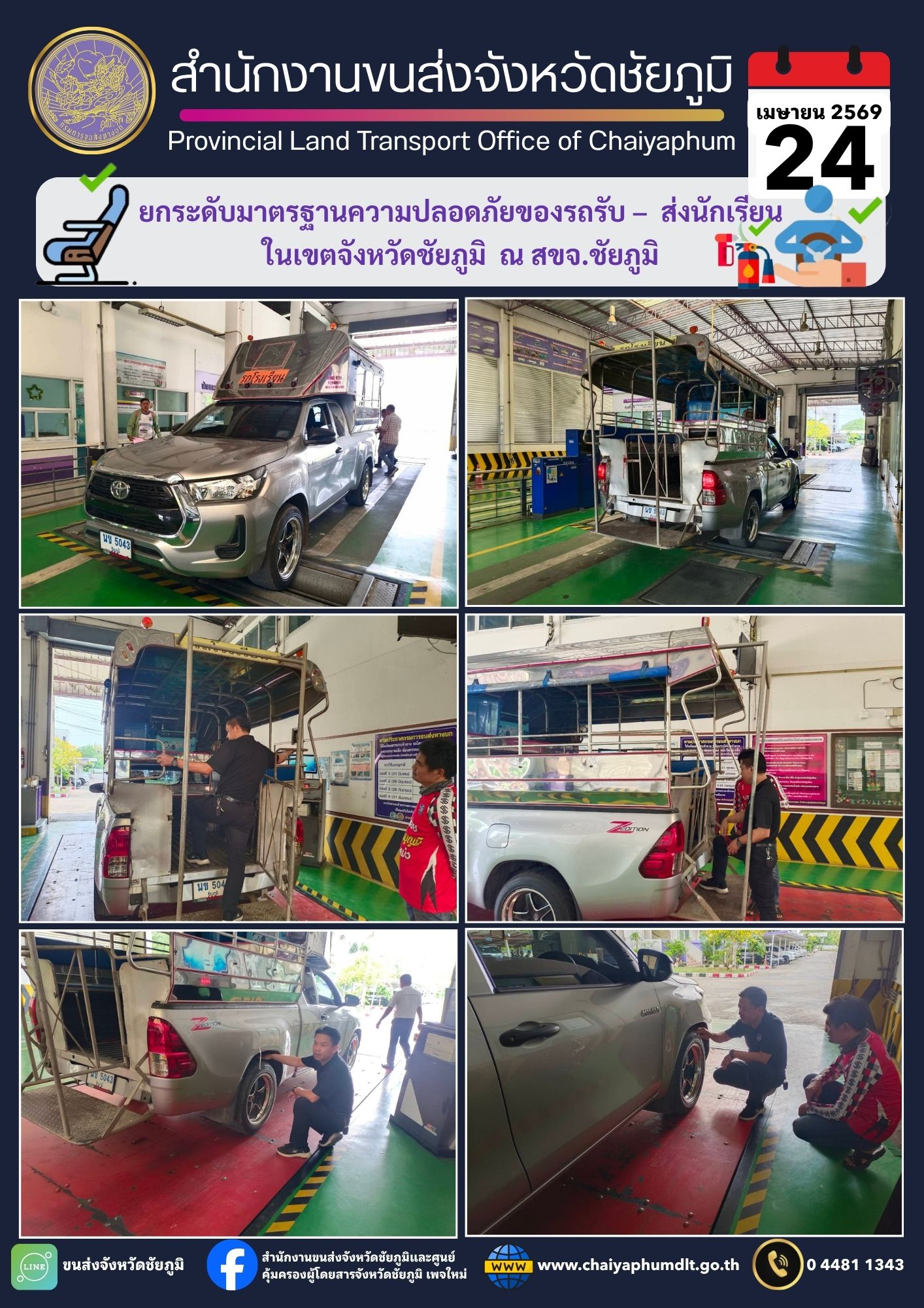 สำนักงานขนส่งจังหวัดชัยภูมิ โดย นายปริญญา หัสดินทร ณ อยุธยา ขนส่งจังหวัดชัยภูมิ มอบหมายให้เจ้าหน้าที่สำนักงานขนส่งจังหวัดชัยภูมิ และ สาขา ลงพื้นที่ออกประชาสัมพันธ์ในการยกระดับมาตรฐานความปลอดภัยของรถรับ – ส่งนักเรียนในเขตจังหวัดชัยภูมิ พร้อมทั้ง อำนวยความสะดวกแก่ผู้ประกอบการรถรับ-ส่งนักเรียน ในการนำรถเข้ารับการตรวจสภาพรถ ได้แก่ ระบบห้ามล้อ ระบบบังคับเลี้ยว เบาะที่นั่ง อุปกรณ์ส่วนควบ ความมั่นคงแข็งแรงของตัวรถ และอุปกรณ์ความปลอดภัยต่างๆ ณ ฝ่ายตรวจสภาพรถ สำนักงานขนส่งจังหวัดชัยภูมิ และสาขา