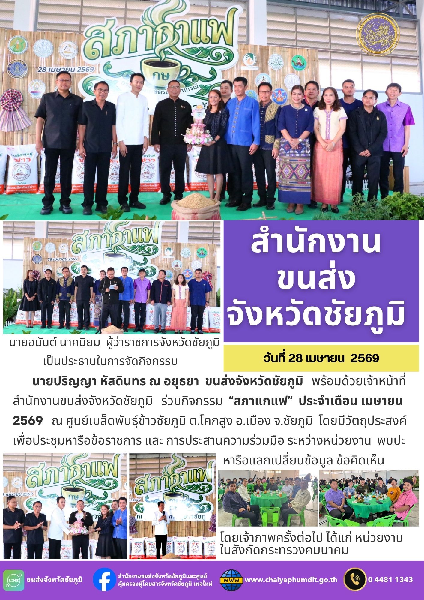 สำนักงานขนส่งจังหวัดชัยภูมิ โดย นายปริญญา หัสดินทร ณ อยุธยา ขนส่งจังหวัดชัยภูมิ พร้อมด้วยเจ้าหน้าที่สำนักงานขนส่งจังหวัดชัยภูมิ ร่วมกิจกรรม “สภากาแฟ” ประจำเดือน เมษายน 2569 โดยมีวัตถุประสงค์เพื่อประชุมหารือข้อราชการ และการประสานความร่วมมือระหว่างหน่วยงาน พบปะหารือแลกเปลี่ยนข้อมูล ข้อคิดเห็น โดยมี นายอนันต์ นาคนิยม ผู้ว่าราชการจังหวัดชัยภูมิ เป็นประธานในการจัดกิจกรรม ณ ศูนย์เมล็ดพันธุ์ข้าวชัยภูมิ ต.โคกสูง อ.เมือง จ.ชัยภูมิ