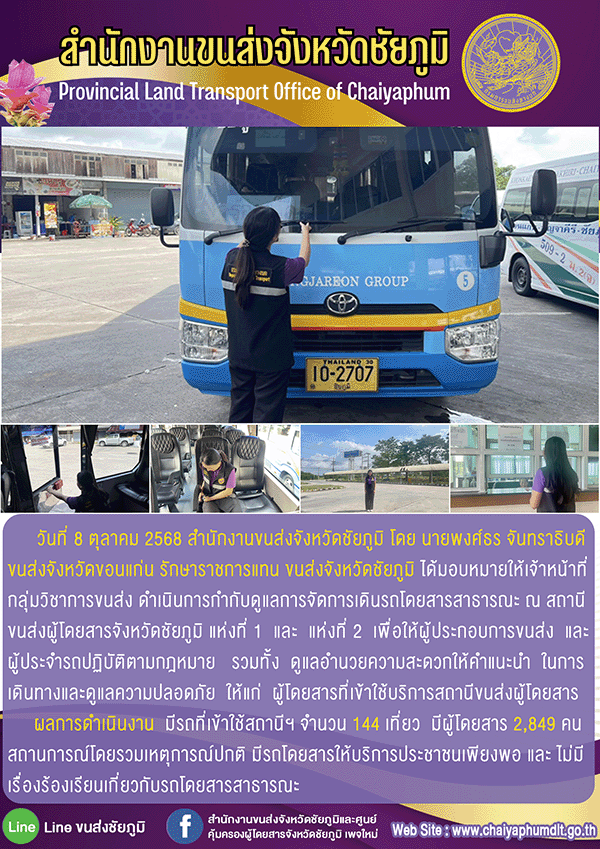 ดำเนินการกำกับ ดูแล การจัดการเดินรถโดยสารสาธารณะ ณ สถานีขนส่งผู้โดยสารจังหวัดชัยภูมิ