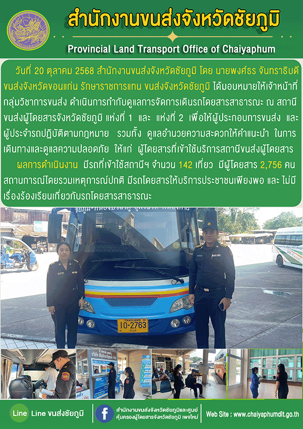 ดำเนินการกำกับ ดูแล การจัดการเดินรถโดยสารสาธารณะ ณ สถานีขนส่งผู้โดยสารจังหวัดชัยภูมิ