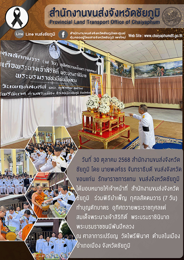 สำนักงานขนส่งจังหวัดชัยภูมิ โดย นายพงศ์ธร จันทราธิบดี ขนส่งจังหวัดขอนแก่น รักษาราชการแทน ขนส่งจังหวัดชัยภูมิ ได้มอบหมายให้เจ้าหน้าที่ ร่วมพิธีบำเพ็ญกุศลสัตตมวาร (7 วัน) ทำบุญตักบาตร อุทิศถวายพระราชกุศลแด่ สมเด็จพระนางเจ้าสิริกิติ์ พระบรมราชินินาถ พระบรมราชชนนีพันปีหลวง ณ ศาลาการเปรียญ วัดไพรีพินาศ ตำบลในเมือง อำเภอเมือง จังหวัดชัยภูมิ