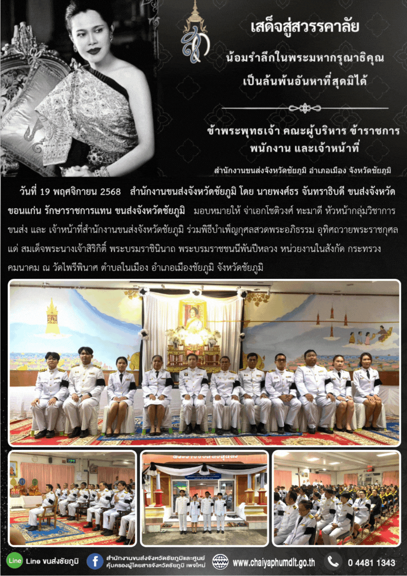 สำนักงานขนส่งจังหวัดชัยภูมิ โดย นายพงศ์ธร จันทราธิบดี ขนส่งจังหวัดขอนแก่น รักษาราชการแทน ขนส่งจังหวัดชัยภูมิ มอบหมายให้ จ่าเอกโชติวงศ์ ทะมาดี หัวหน้ากลุ่มวิชาการขนส่ง และเจ้าหน้าที่สำนักงานขนส่งจังหวัดชัยภูมิ ร่วมพิธีบำเพ็ญกุศลสวดพระอภิธรรม อุทิศถวายพระราชกุศลแด่ สมเด็จพระนางเจ้าสิริกิติ์ พระบรมราชินินาถ พระบรมราชชนนีพันปีหลวง หน่วยงานในสังกัด กระทรวงคมนาคม ณ วัดไพรีพินาศ ตำบลในเมือง อำเภอเมืองชัยภูมิ จังหวัดชัยภูมิ
