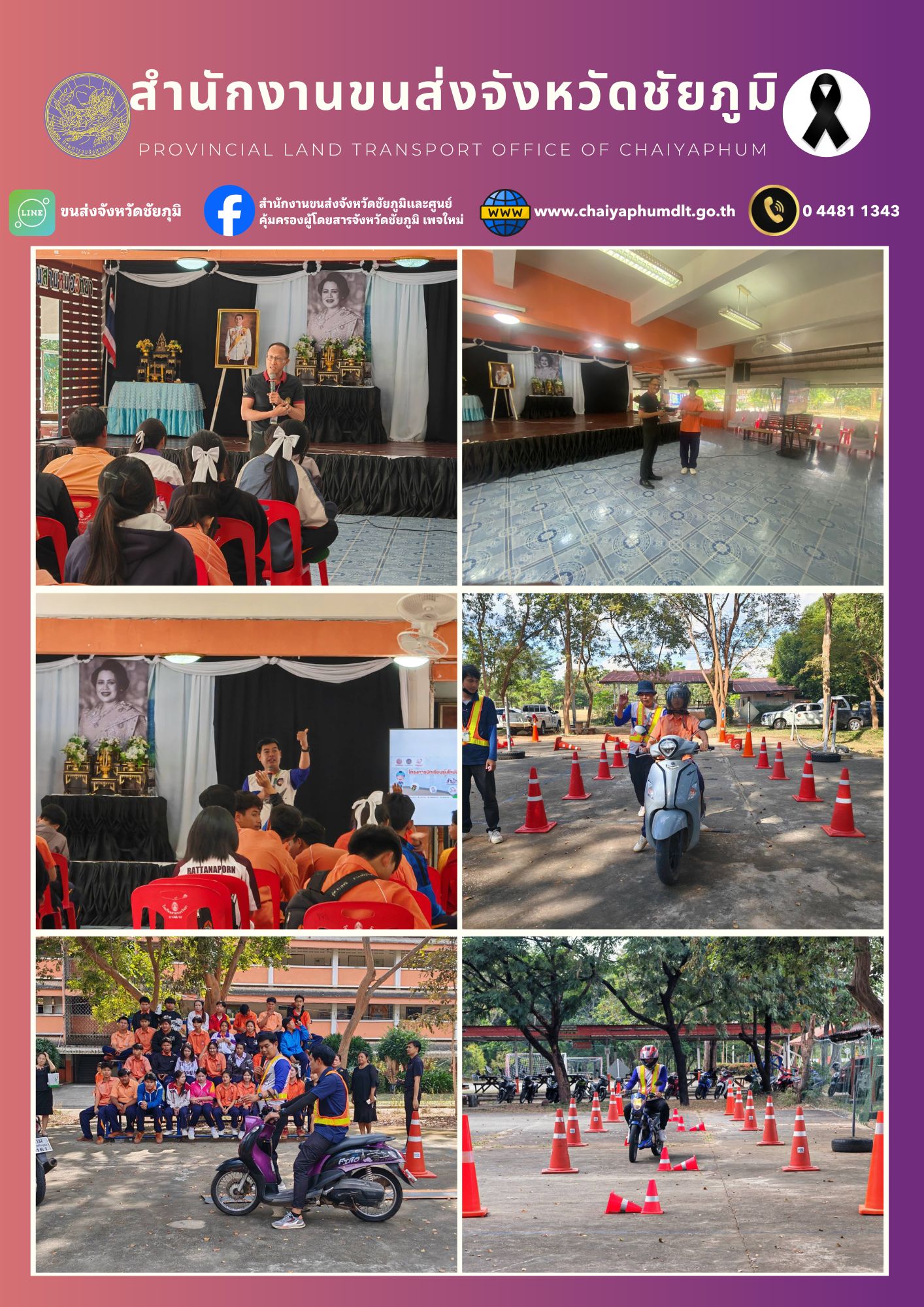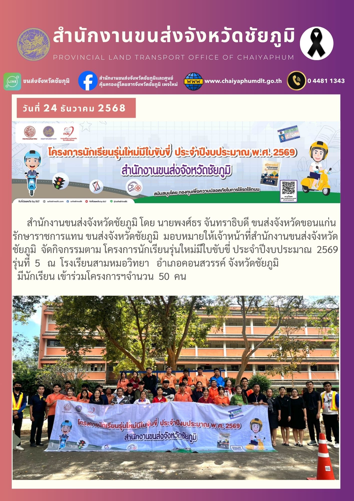 สำนักงานขนส่งจังหวัดชัยภูมิ โดยนายพงศ์ธร จันทราธิบดี ขนส่งจังหวัดขอนแก่น รักษาราชการแทน ขนส่งจังหวัดชัยภูมิ มอบหมายให้เจ้าหน้าที่สำนักงานขนส่งจังหวัดชัยภูมิ จัดกิจกรรมตาม โครงการนักเรียนรุ่นใหม่มีใบขับขี่ ประจำปีงบประมาณ 2569 รุ่นที่ 5 ณ โรงเรียนสามหมอวิทยา อำเภอคอนสวรรค์ จังหวัดชัยภูมิ