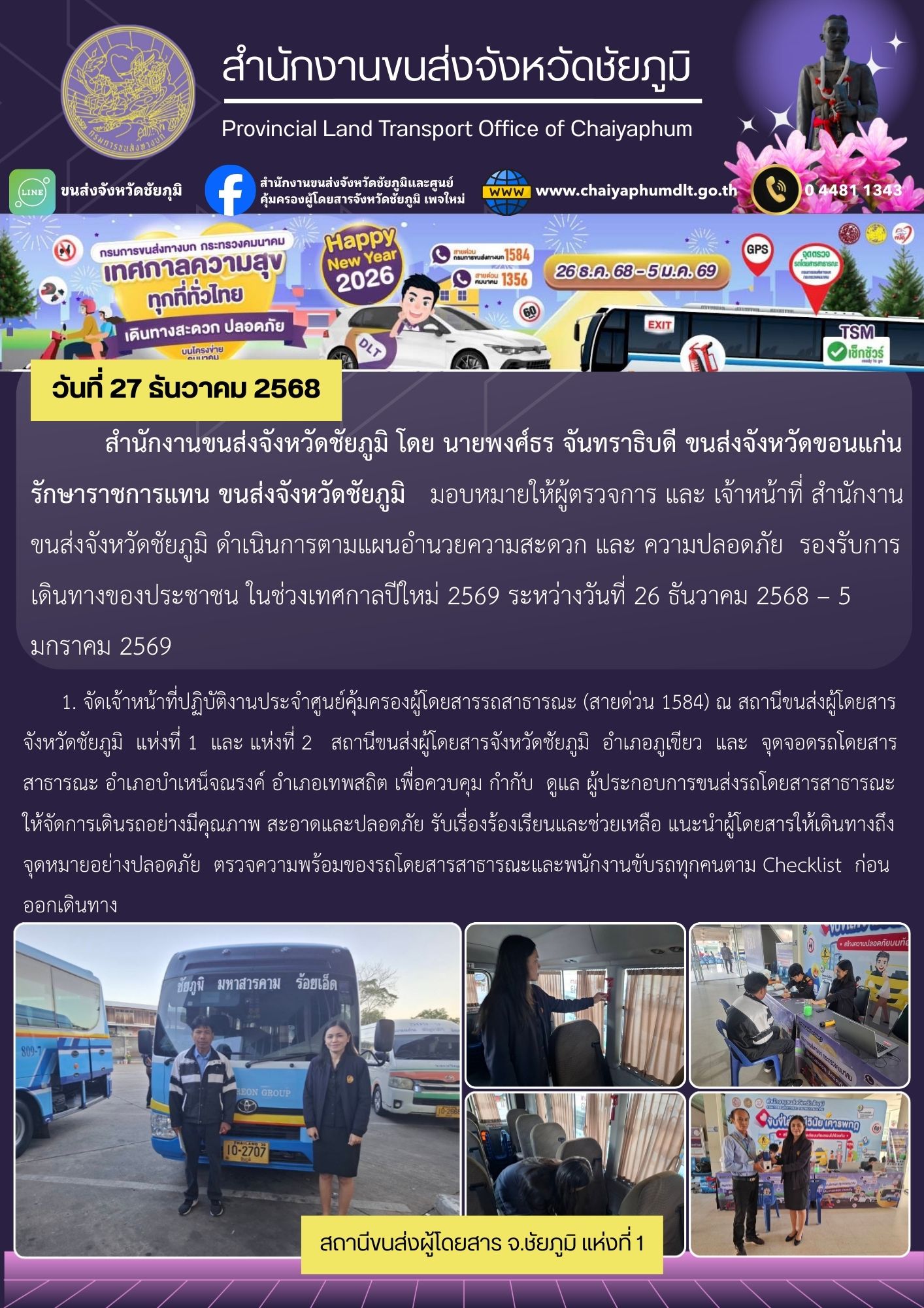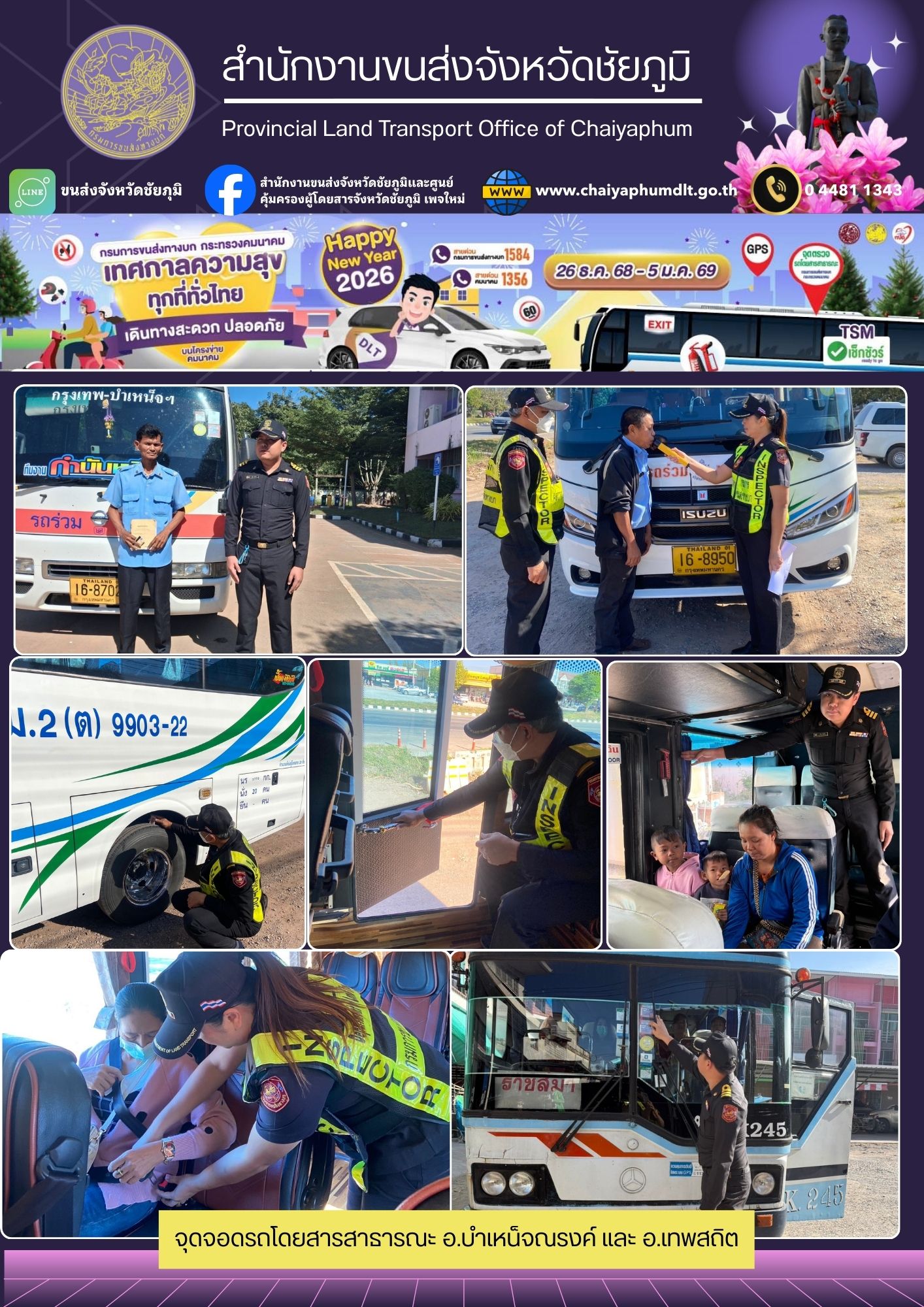 สำนักงานขนส่งจังหวัดชัยภูมิ โดย นายพงศ์ธร จันทราธิบดี ขนส่งจังหวัดขอนแก่น รักษาราชการแทน ขนส่งจังหวัดชัยภูมิ มอบหมายให้ผู้ตรวจการ และ เจ้าหน้าที่ สำนักงานขนส่งจังหวัดชัยภูมิ ดำเนินการตามแผนอำนวยความสะดวกและความปลอดภัย รองรับการเดินทางของประชาชน ในช่วงเทศกาลปีใหม่ 2569 ระหว่างวันที่ 26 ธันวาคม 2568 – 5 มกราคม 2569