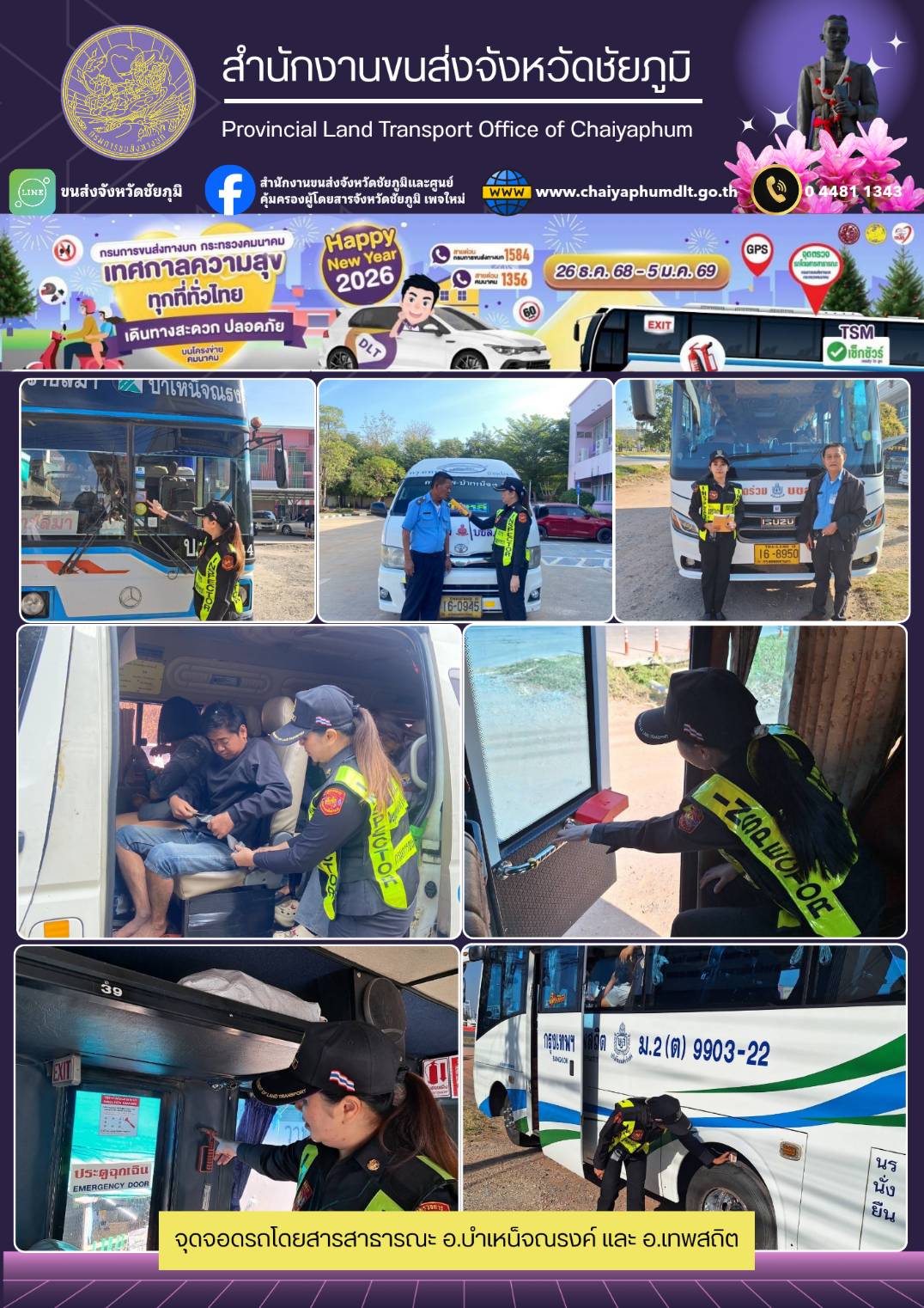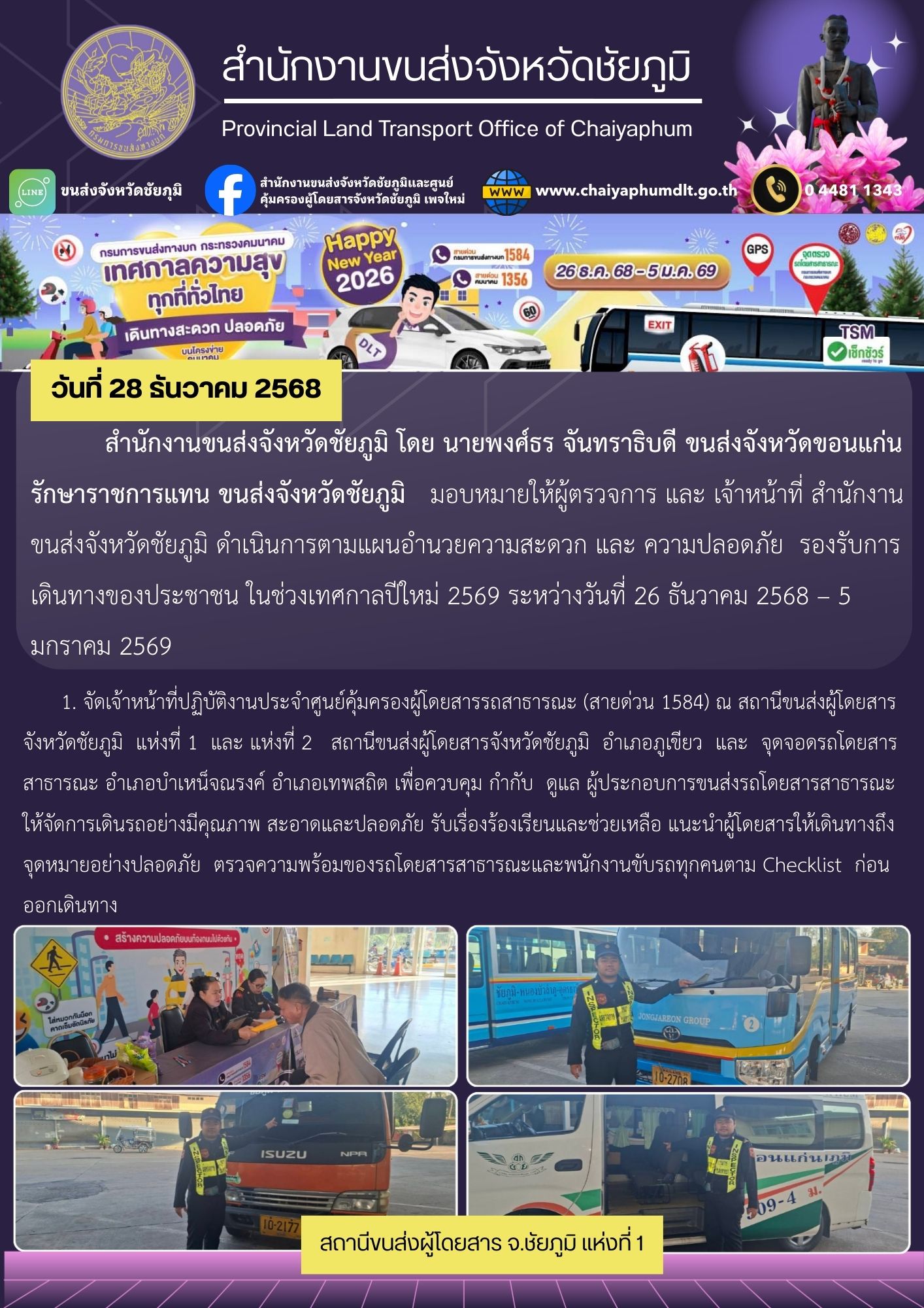 สำนักงานขนส่งจังหวัดชัยภูมิ โดย นายพงศ์ธร จันทราธิบดี ขนส่งจังหวัดขอนแก่น รักษาราชการแทน ขนส่งจังหวัดชัยภูมิ มอบหมายให้ผู้ตรวจการ และ เจ้าหน้าที่ สำนักงานขนส่งจังหวัดชัยภูมิ ดำเนินการตามแผนอำนวยความสะดวกและความปลอดภัย รองรับการเดินทางของประชาชน ในช่วงเทศกาลปีใหม่ 2569 ระหว่างวันที่ 26 ธันวาคม 2568 – 5 มกราคม 2569