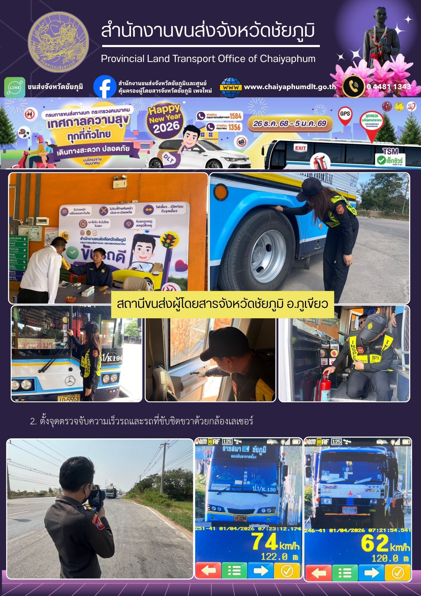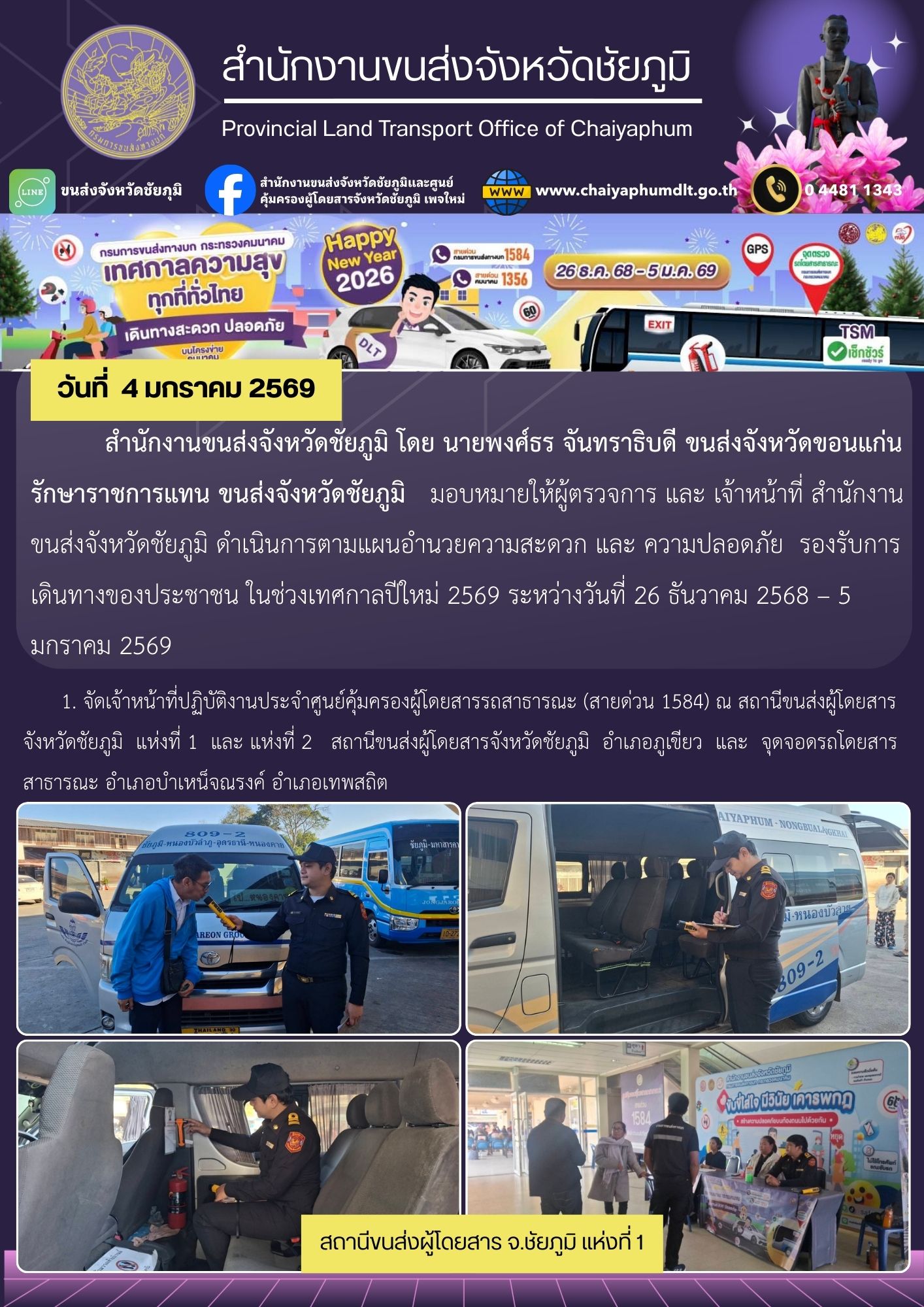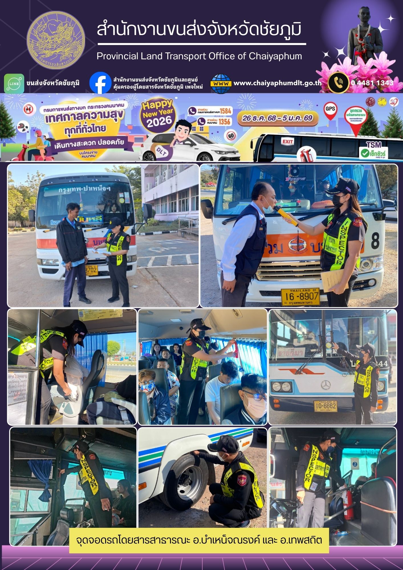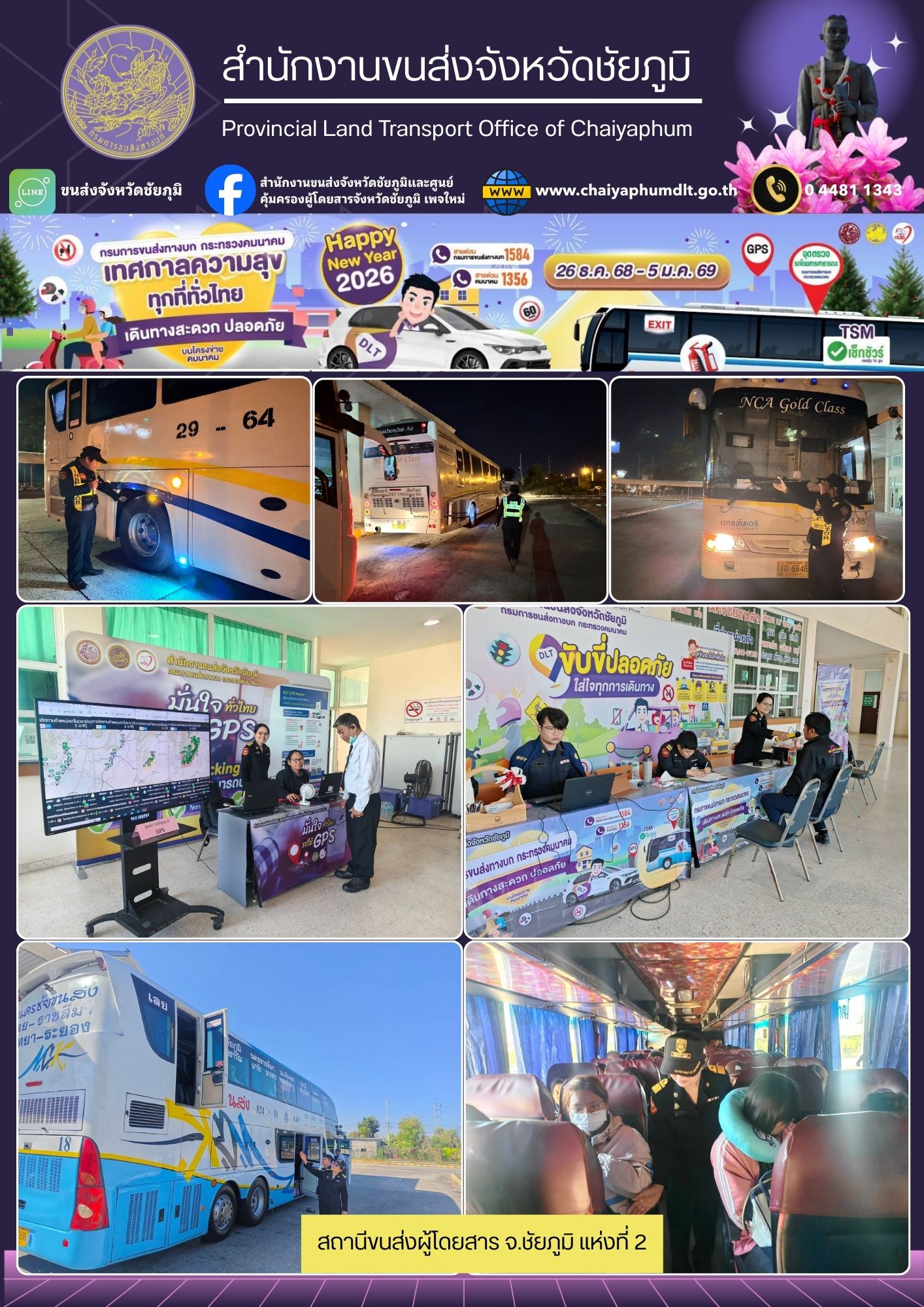สำนักงานขนส่งจังหวัดชัยภูมิ โดย นายพงศ์ธร จันทราธิบดี ขนส่งจังหวัดขอนแก่น รักษาราชการแทน ขนส่งจังหวัดชัยภูมิ มอบหมายให้ผู้ตรวจการ และ เจ้าหน้าที่ สำนักงานขนส่งจังหวัดชัยภูมิ ดำเนินการตามแผนอำนวยความสะดวกและความปลอดภัย รองรับการเดินทางของประชาชน ในช่วงเทศกาลปีใหม่ 2569 ระหว่างวันที่ 26 ธันวาคม 2568 – 5 มกราคม 2569