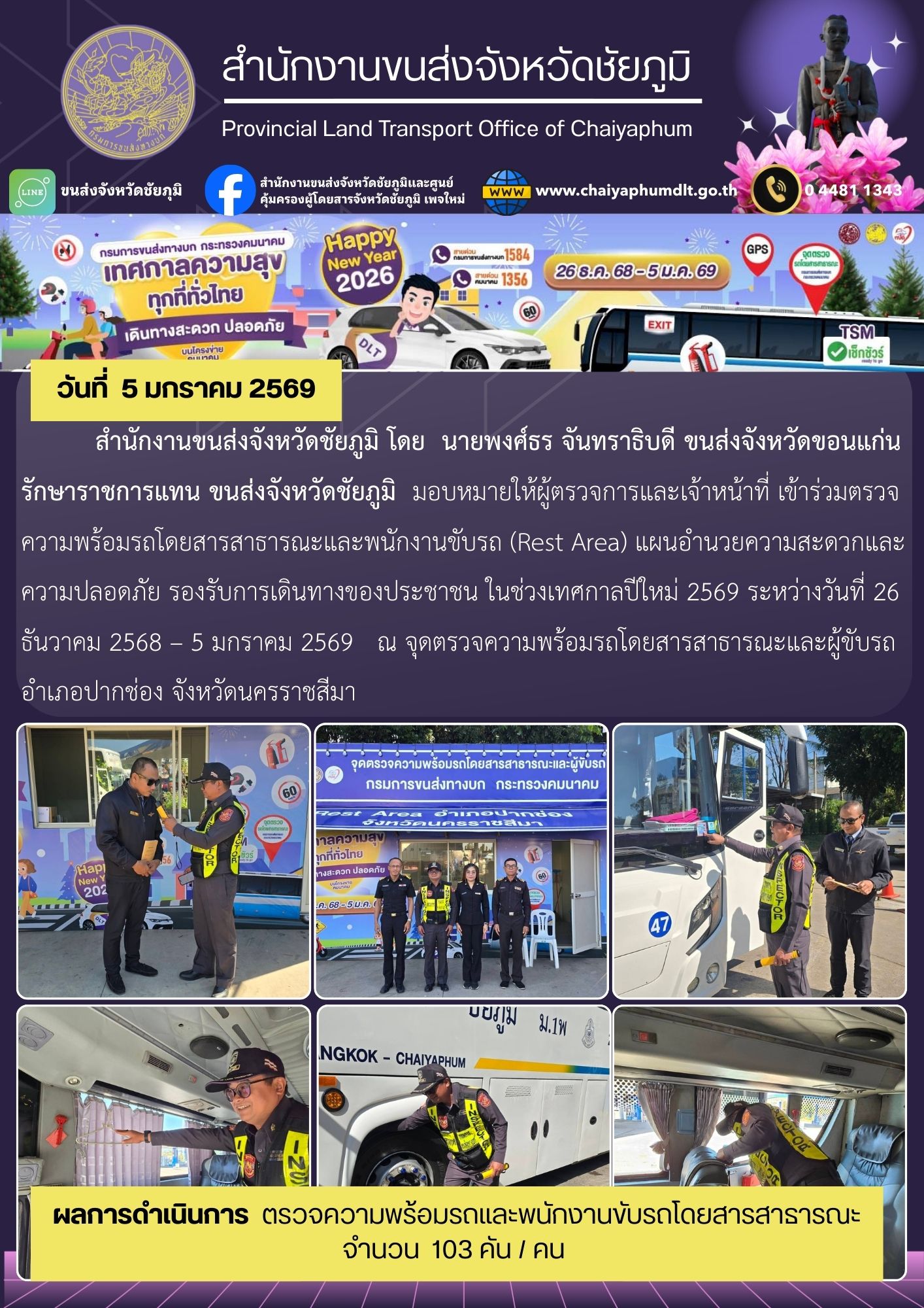 สำนักงานขนส่งจังหวัดชัยภูมิ โดย นายพงศ์ธร จันทราธิบดี ขนส่งจังหวัดขอนแก่น รักษาราชการแทน ขนส่งจังหวัดชัยภูมิ มอบหมายให้ผู้ตรวจการและเจ้าหน้าที่ เข้าร่วมตรวจความพร้อมรถโดยสารสาธารณะและพนักงานขับรถ (Rest Area) แผนอำนวยความสะดวกและความปลอดภัย รองรับการเดินทางของประชาชน ในช่วงเทศกาลปีใหม่ 2569 ระหว่างวันที่ 26 ธันวาคม 2568 – 5 มกราคม 2569 ณ จุดตรวจความพร้อมรถโดยสารสาธารณะและผู้ขับรถ อำเภอปากช่อง จังหวัดนครราชสีมา
