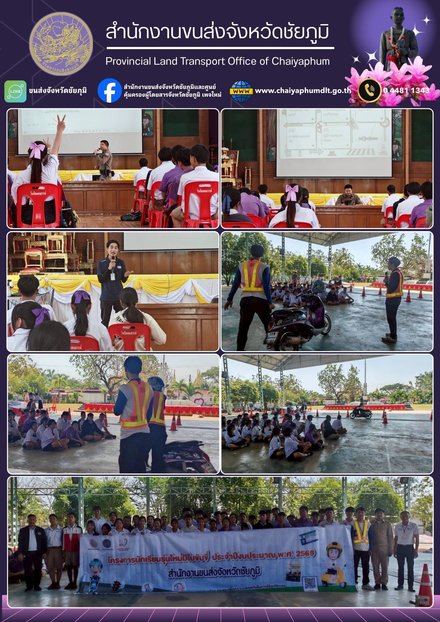 สำนักงานขนส่งจังหวัดชัยภูมิ  โดย นายปริญญา หัสดินทร ณ อยุธยา ขนส่งจังหวัดชัยภูมิ มอบหมายให้เจ้าหน้าที่สำนักงานขนส่งจังหวัดชัยภูมิ ดำเนินกิจกรรมตาม โครงการนักเรียนรุ่นใหม่มีใบขับขี่ ประจำปีงบประมาณ 2569 รุ่นที่ 10 ณ โรงเรียนคอนสวรรค์ อำเภอคอนสวรรค์ จังหวัดชัยภูมิ