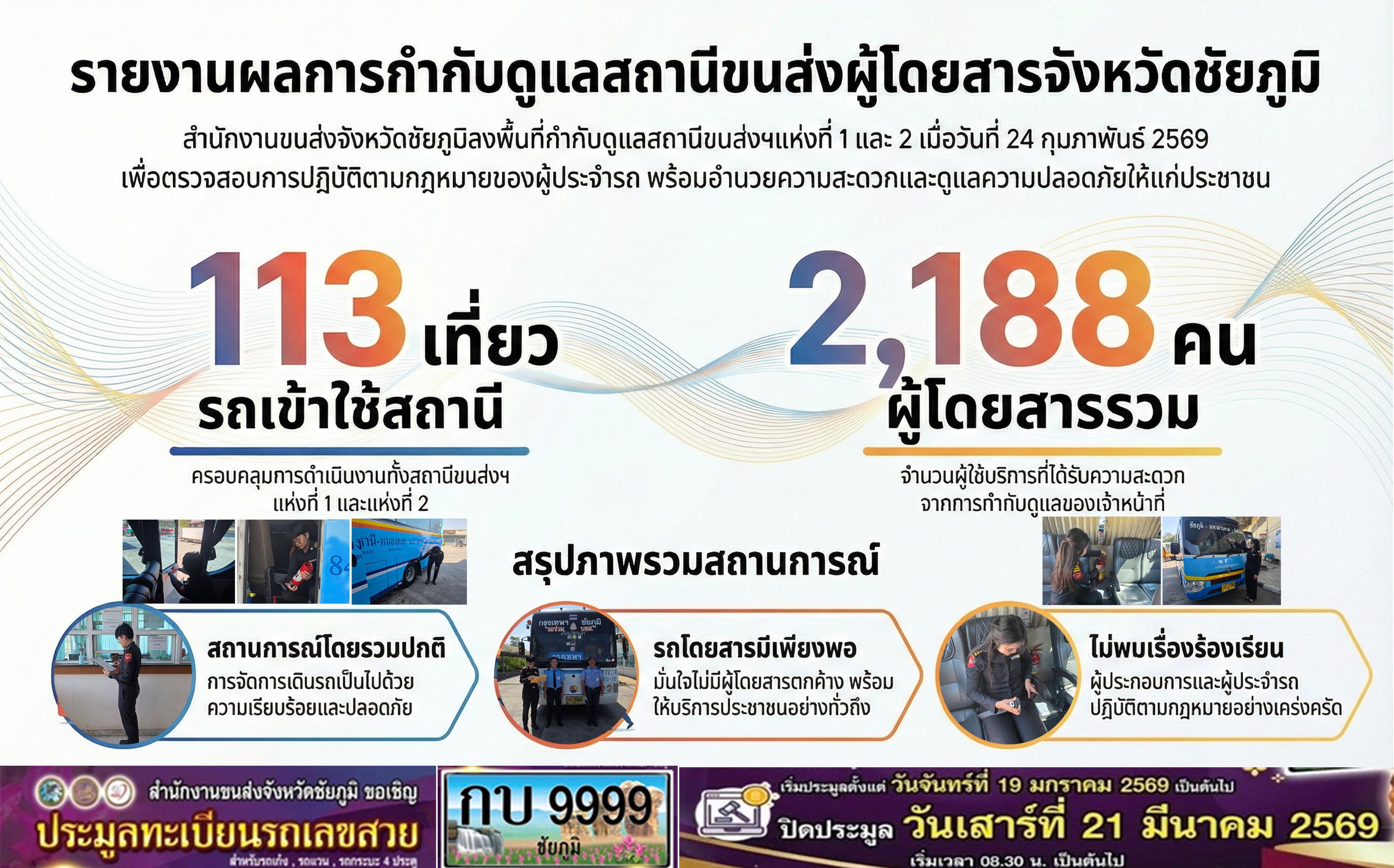 สำนักงานขนส่งจังหวัดชัยภูมิ ดำเนินการกำกับ ดูแล การจัดการเดินรถโดยสารสาธารณะ ณ สถานีขนส่งผู้โดยสารจังหวัดชัยภูมิ  เพื่อให้ผู้ประกอบการขนส่ง และผู้ประจำรถปฏิบัติตามกฎหมาย รวมทั้งดูแลอำนวยความสะดวก ให้คำแนะนำในการเดินทาง และดูแลความปลอดภัยให้แก่ผู้โดยสารที่เข้าใช้บริการสถานีขนส่งผู้โดยสาร สถานการณ์โดยรวมเหตุการณ์ปกติ มีรถโดยสารให้บริการประชาชนเพียงพอ และไม่มีเรื่องร้องเรียนเกี่ยวกับรถโดยสารสาธารณะ
