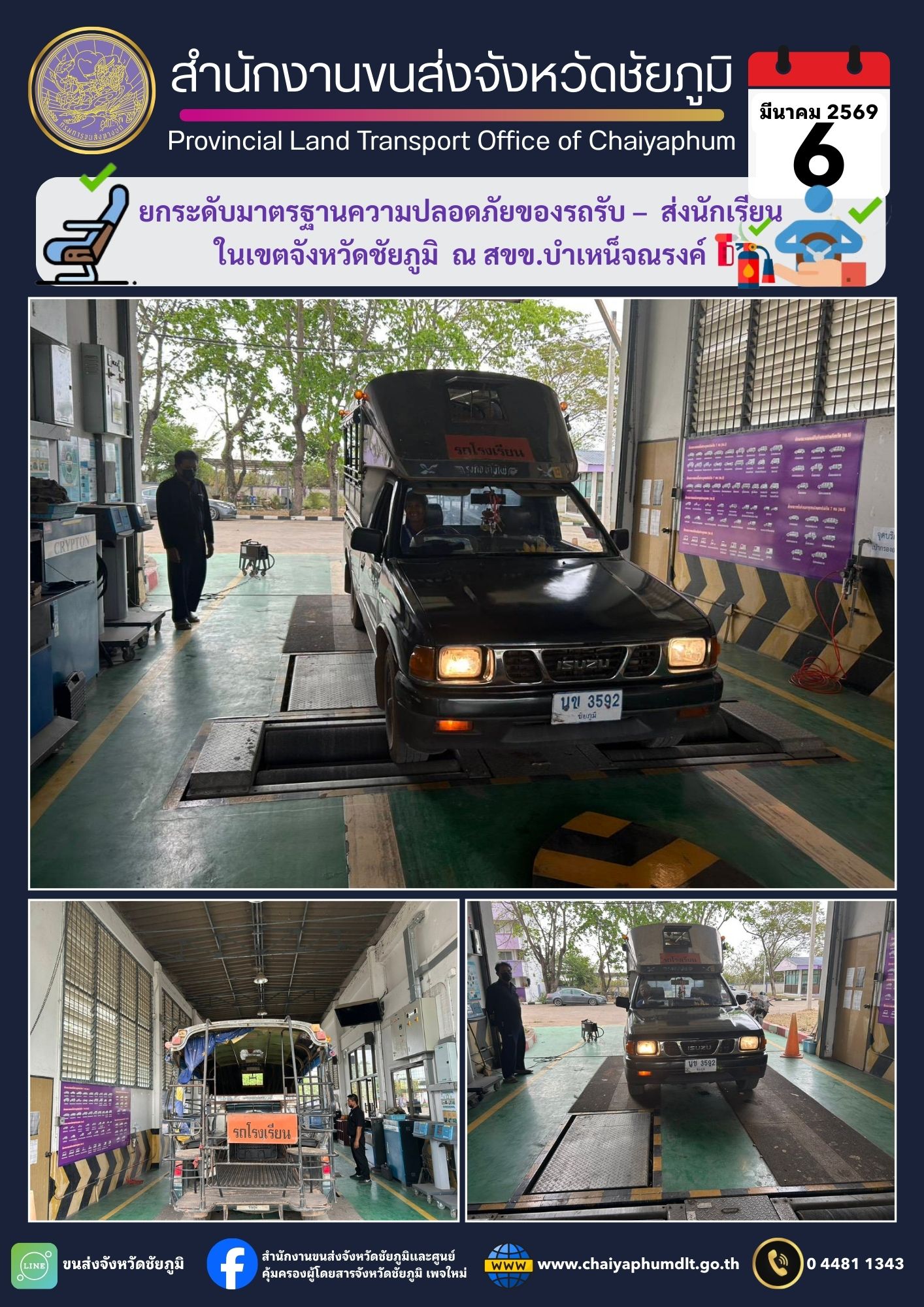 สำนักงานขนส่งจังหวัดชัยภูมิ โดย นายปริญญา หัสดินทร ณ อยุธยา ขนส่งจังหวัดชัยภูมิ มอบหมายให้เจ้าหน้าที่สำนักงานขนส่งจังหวัดชัยภูมิ และ สาขา ลงพื้นที่ออกประชาสัมพันธ์ในการยกระดับมาตรฐานความปลอดภัยของรถรับ – ส่งนักเรียนในเขตจังหวัดชัยภูมิ พร้อมทั้ง อำนวยความสะดวกแก่ผู้ประกอบการรถรับ-ส่งนักเรียน ในการนำรถเข้ารับการตรวจสภาพรถ ได้แก่ ระบบห้ามล้อ ระบบบังคับเลี้ยว เบาะที่นั่ง อุปกรณ์ส่วนควบ ความมั่นคงแข็งแรงของตัวรถ และอุปกรณ์ความปลอดภัยต่างๆ ณ ฝ่ายตรวจสภาพรถ สำนักงานขนส่งจังหวัดชัยภูมิ และสาขา