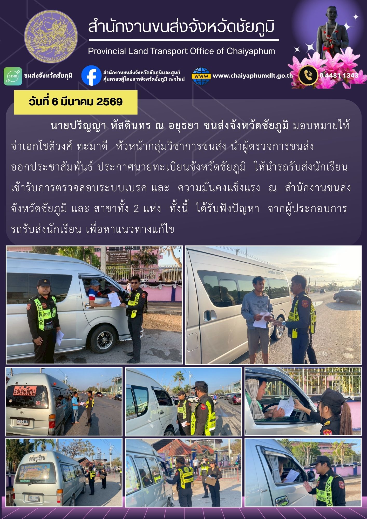สำนักงานขนส่งจังหวัดชัยภูมิ โดย นายปริญญา หัสดินทร ณ อยุธยา ขนส่งจังหวัดชัยภูมิ มอบหมายให้ จ่าเอกโชติวงศ์ ทะมาดี หัวหน้ากลุ่มวิชาการขนส่ง นำผู้ตรวจการขนส่ง ออกประชาสัมพันธ์ ประกาศนายทะเบียนจังหวัดชัยภูมิ ให้นำรถรับส่งนักเรียนเข้ารับการตรวจสอบระบบเบรค และความมั่นคงแข็งแรง ณ สำนักงานขนส่งจังหวัดชัยภูมิ และ สาขาทั้ง 2 แห่ง ทั้งนี้ได้รับฟังปัญหา จากผู้ประกอบการรถรับส่งนักเรียน เพื่อหาแนวทางแก้ไข