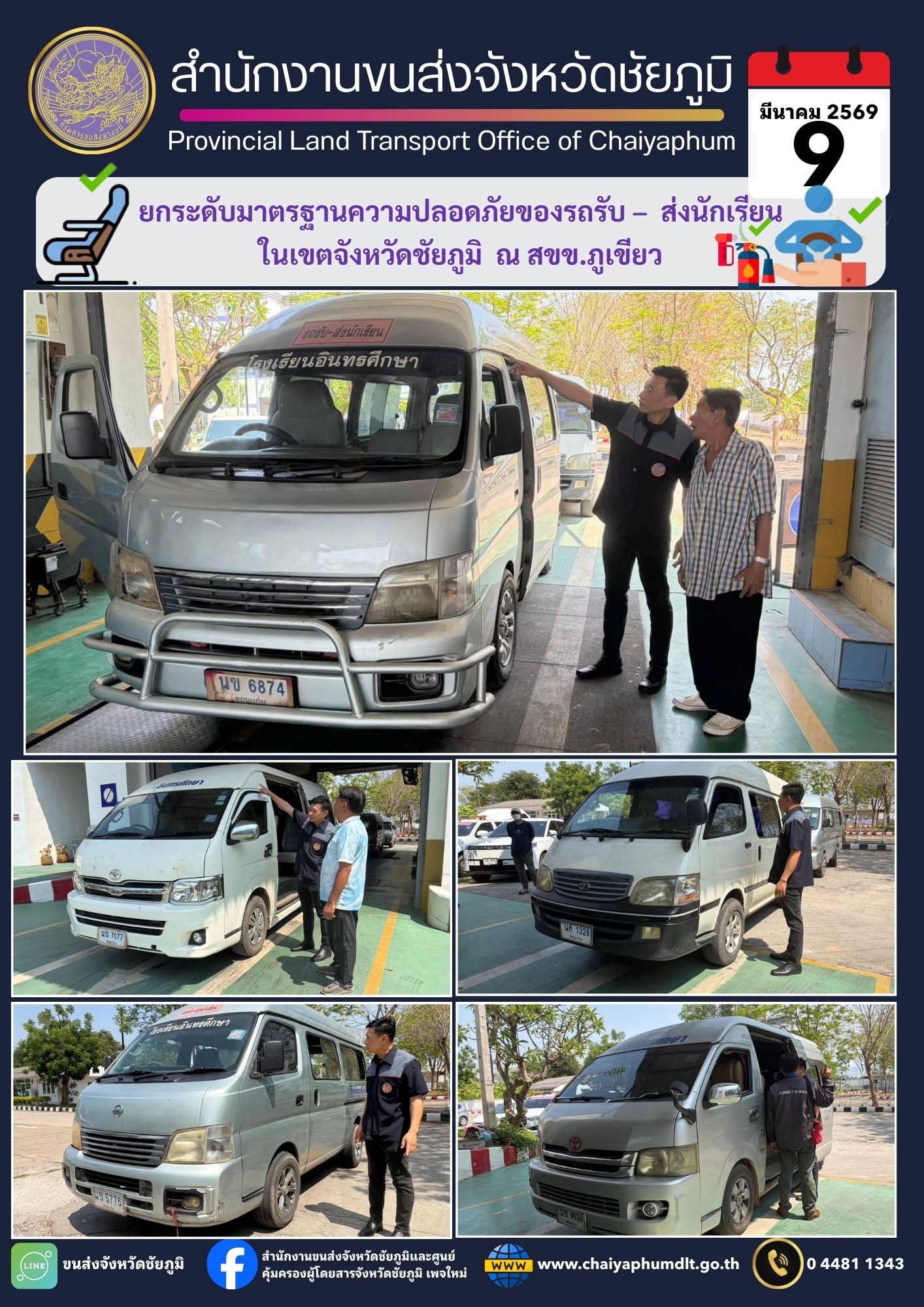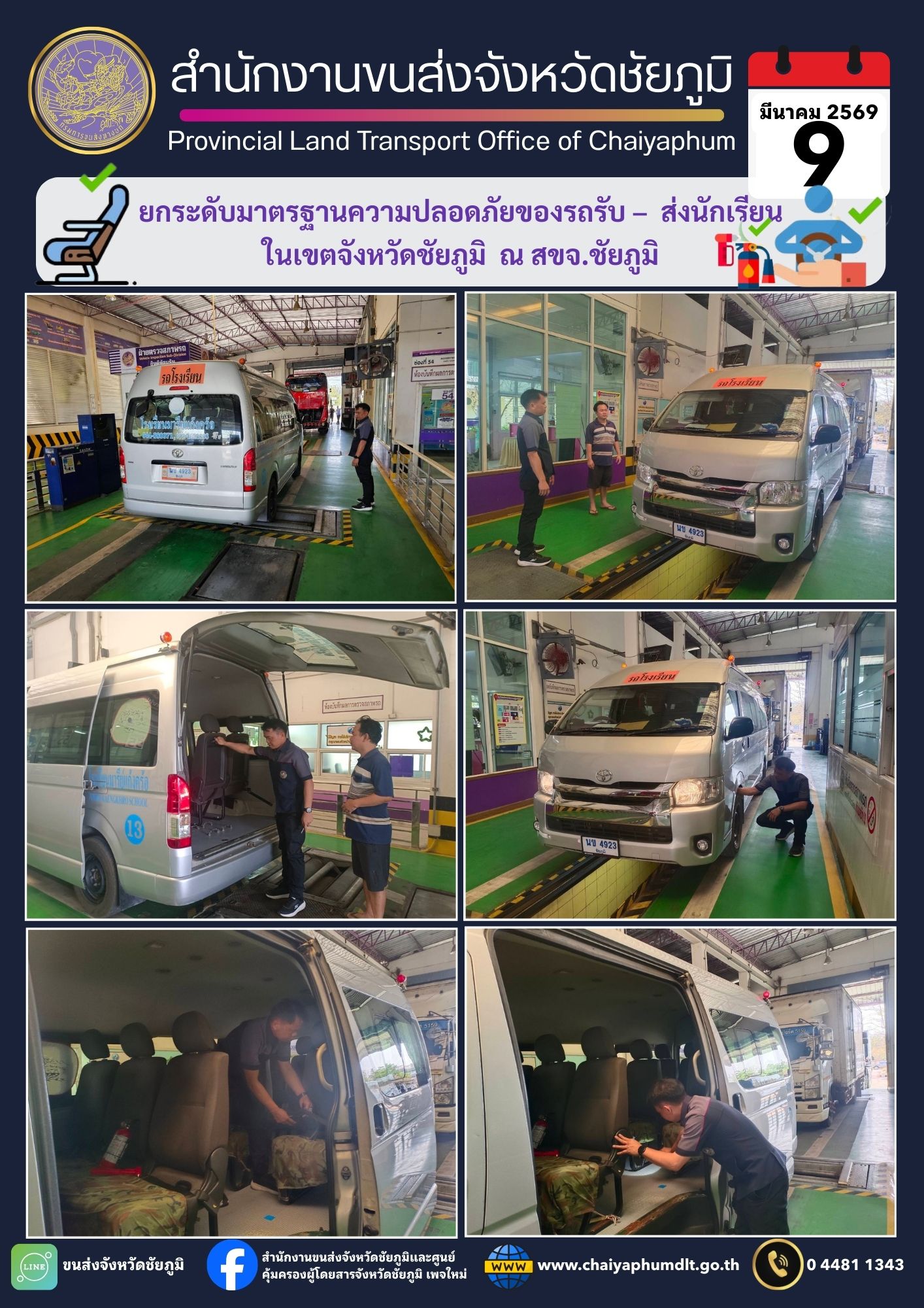 สำนักงานขนส่งจังหวัดชัยภูมิ โดย นายปริญญา หัสดินทร ณ อยุธยา ขนส่งจังหวัดชัยภูมิ มอบหมายให้เจ้าหน้าที่สำนักงานขนส่งจังหวัดชัยภูมิ และ สาขา ลงพื้นที่ออกประชาสัมพันธ์ในการยกระดับมาตรฐานความปลอดภัยของรถรับ – ส่งนักเรียนในเขตจังหวัดชัยภูมิ พร้อมทั้ง อำนวยความสะดวกแก่ผู้ประกอบการรถรับ-ส่งนักเรียน ในการนำรถเข้ารับการตรวจสภาพรถ ได้แก่ ระบบห้ามล้อ ระบบบังคับเลี้ยว เบาะที่นั่ง อุปกรณ์ส่วนควบ ความมั่นคงแข็งแรงของตัวรถ และอุปกรณ์ความปลอดภัยต่างๆ ณ ฝ่ายตรวจสภาพรถ สำนักงานขนส่งจังหวัดชัยภูมิ และสาขา