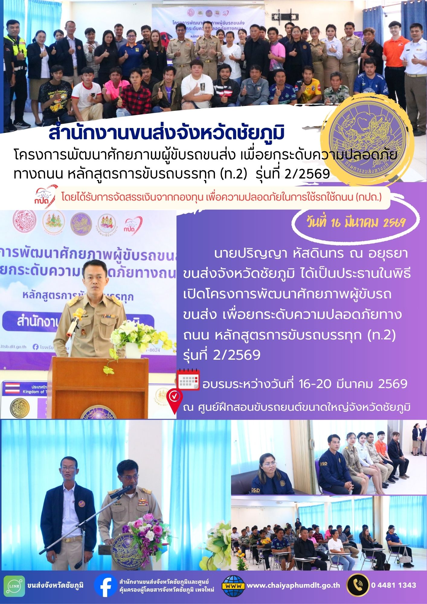 สำนักงานขนส่งจังหวัดชัยภูมิ โดย นายปริญญา หัสดินทร ณ อยุธยา ขนส่งจังหวัดชัยภูมิ ได้เป็นประธานในพิธีเปิดโครงการพัฒนาศักยภาพผู้ขับรถขนส่ง เพื่อยกระดับความปลอดภัยทางถนน หลักสูตรการขับรถบรรทุก รุ่นที่ 2/2569 โดยได้รับการจัดสรรเงินจากกองทุนเพื่อความปลอดภัยในการใช้รถใช้ถนน (กปถ.) ในการนี้ ได้ดำเนินการบูรณาการร่วมกับสำนักงานพัฒนาฝีมือแรงงานชัยภูมิ อบรมระหว่างวันที่ 16-20 มีนาคม 2569 มีผู้เข้ารับการอบรมจำนวน 30 คน ณ ศูนย์ฝึกสอนขับรถยนต์ขนาดใหญ่จังหวัดชัยภูมิ
