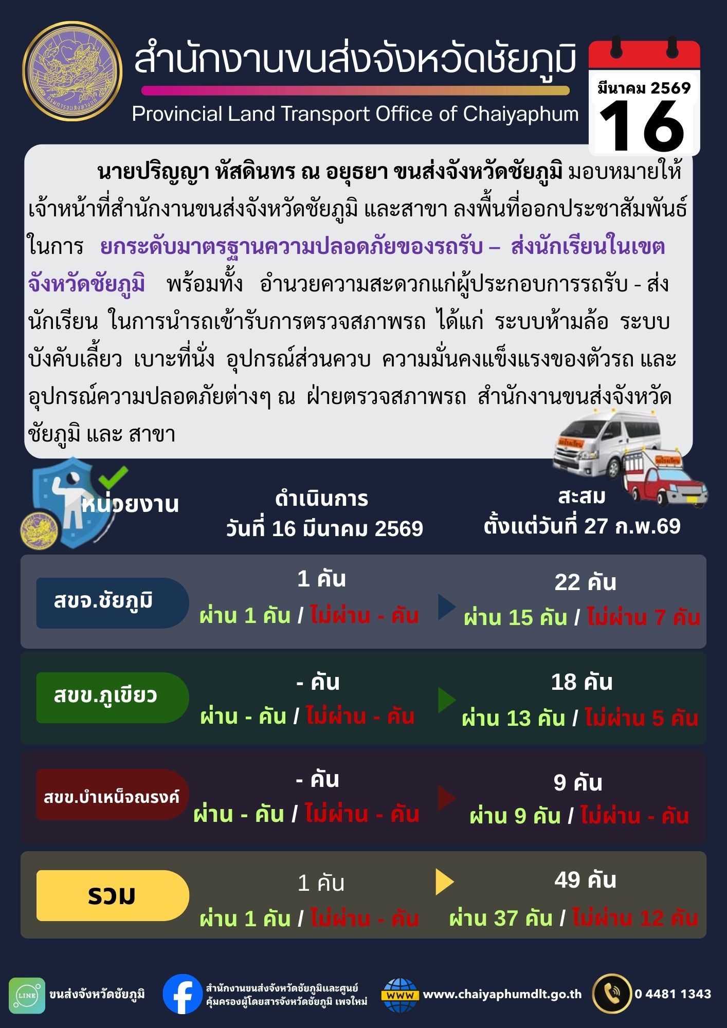 สำนักงานขนส่งจังหวัดชัยภูมิ โดย นายปริญญา หัสดินทร ณ อยุธยา ขนส่งจังหวัดชัยภูมิ มอบหมายให้เจ้าหน้าที่สำนักงานขนส่งจังหวัดชัยภูมิ และ สาขา ลงพื้นที่ออกประชาสัมพันธ์ในการยกระดับมาตรฐานความปลอดภัยของรถรับ – ส่งนักเรียนในเขตจังหวัดชัยภูมิ พร้อมทั้ง อำนวยความสะดวกแก่ผู้ประกอบการรถรับ-ส่งนักเรียน ในการนำรถเข้ารับการตรวจสภาพรถ ได้แก่ ระบบห้ามล้อ ระบบบังคับเลี้ยว เบาะที่นั่ง อุปกรณ์ส่วนควบ ความมั่นคงแข็งแรงของตัวรถ และอุปกรณ์ความปลอดภัยต่างๆ ณ ฝ่ายตรวจสภาพรถ สำนักงานขนส่งจังหวัดชัยภูมิ และสาขา