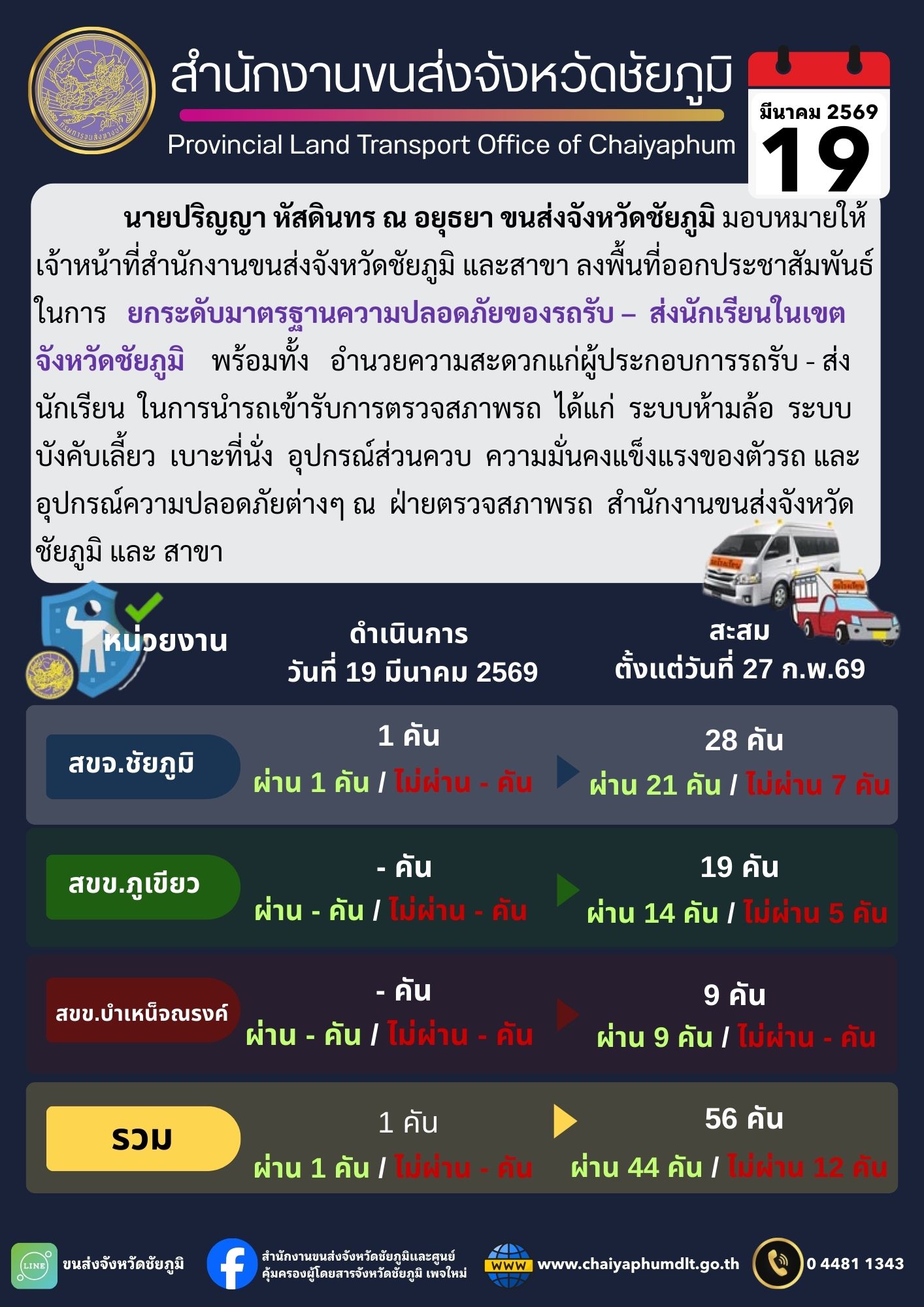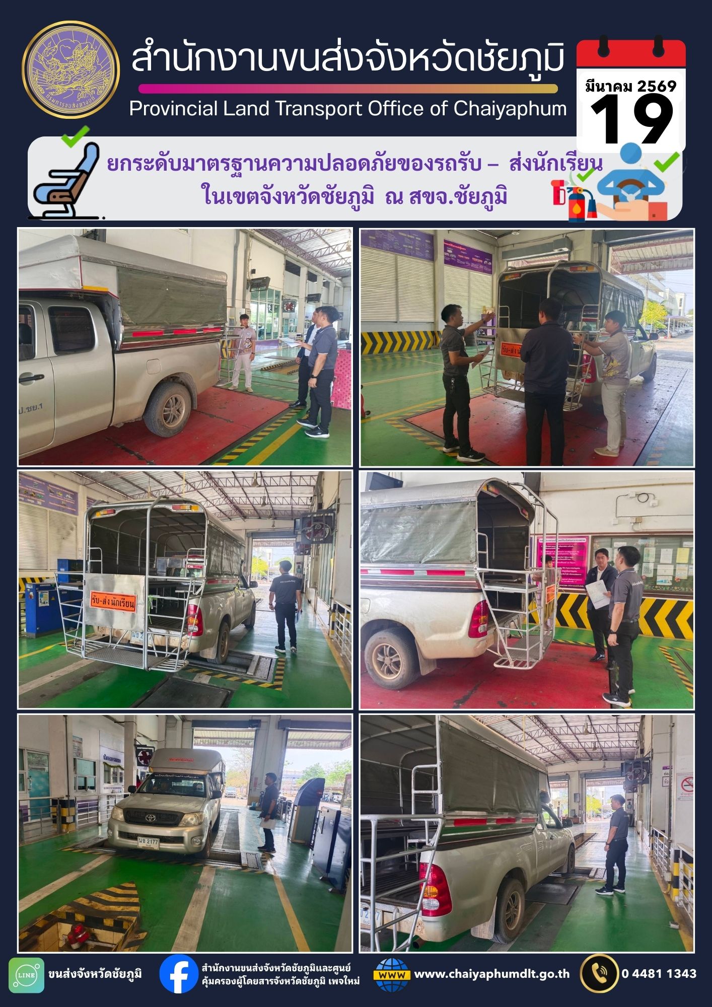 สำนักงานขนส่งจังหวัดชัยภูมิ โดย นายปริญญา หัสดินทร ณ อยุธยา ขนส่งจังหวัดชัยภูมิ มอบหมายให้เจ้าหน้าที่สำนักงานขนส่งจังหวัดชัยภูมิ และ สาขา ลงพื้นที่ออกประชาสัมพันธ์ในการยกระดับมาตรฐานความปลอดภัยของรถรับ – ส่งนักเรียนในเขตจังหวัดชัยภูมิ พร้อมทั้ง อำนวยความสะดวกแก่ผู้ประกอบการรถรับ-ส่งนักเรียน ในการนำรถเข้ารับการตรวจสภาพรถ ได้แก่ ระบบห้ามล้อ ระบบบังคับเลี้ยว เบาะที่นั่ง อุปกรณ์ส่วนควบ ความมั่นคงแข็งแรงของตัวรถ และอุปกรณ์ความปลอดภัยต่างๆ ณ ฝ่ายตรวจสภาพรถ สำนักงานขนส่งจังหวัดชัยภูมิ และสาขา