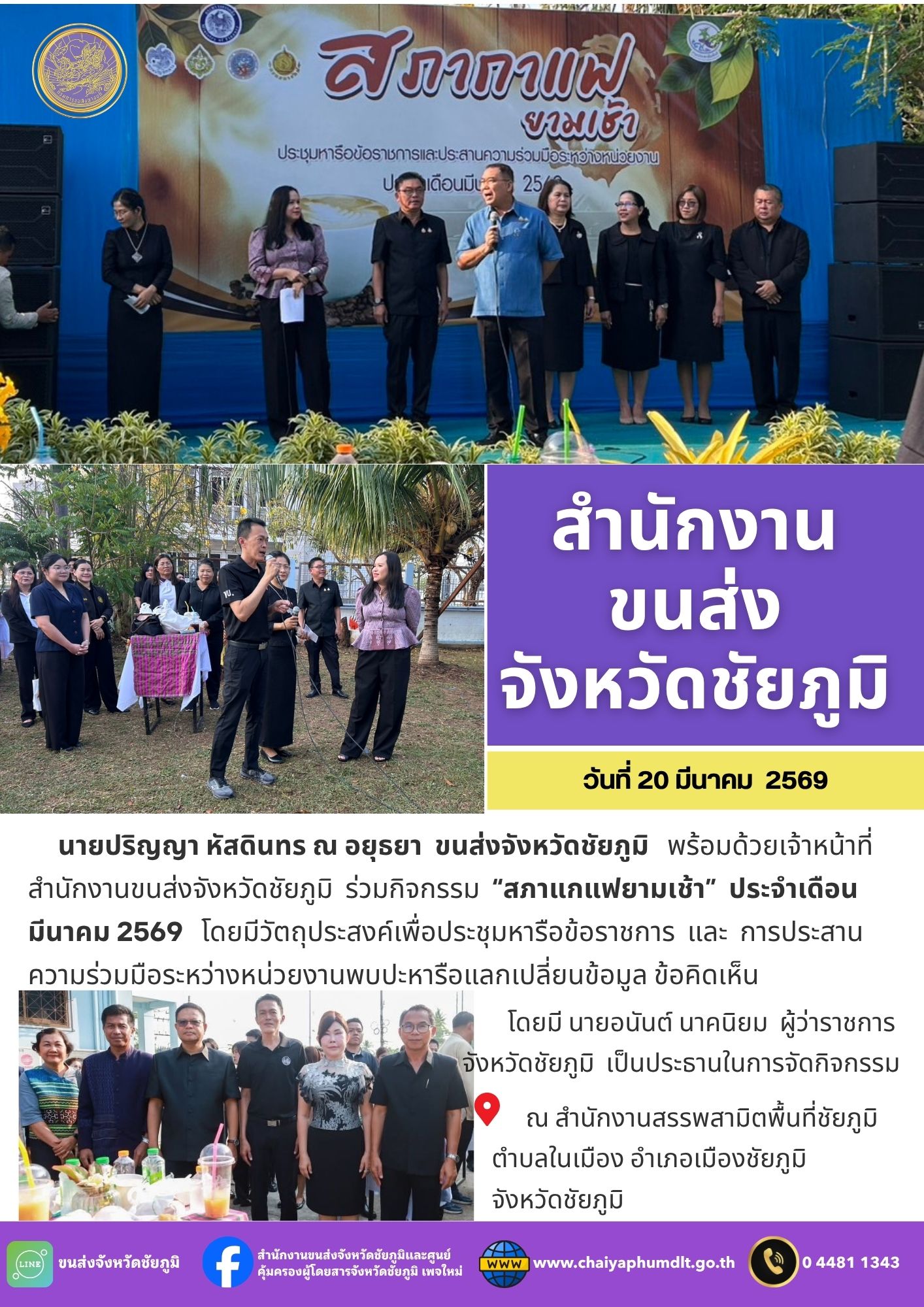 สำนักงานขนส่งจังหวัดชัยภูมิ โดย นายปริญญา หัสดินทร ณ อยุธยา ขนส่งจังหวัดชัยภูมิ พร้อมด้วยเจ้าหน้าที่สำนักงานขนส่งจังหวัดชัยภูมิ ร่วมกิจกรรม “สภากาแฟยามเช้า” ประจำเดือนมีนาคม 2569 โดยมีวัตถุประสงค์เพื่อประชุมหารือข้อราชการ และการประสานความร่วมมือระหว่างหน่วยงาน พบปะหารือแลกเปลี่ยนข้อมูล ข้อคิดเห็น โดยมี นายอนันต์ นาคนิยม ผู้ว่าราชการจังหวัดชัยภูมิ เป็นประธานในการจัดกิจกรรม ณ สำนักงานสรรพสามิตพื้นที่ชัยภูมิ ตำบลในเมือง อำเภอเมืองชัยภูมิ จังหวัดชัยภูมิ